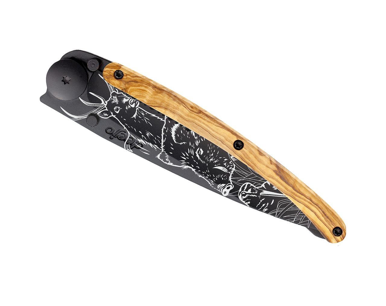 Kapesní nůž Deejo 1GB512 Tattoo Serration Black 37g olive wood Hunting Scene