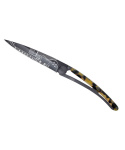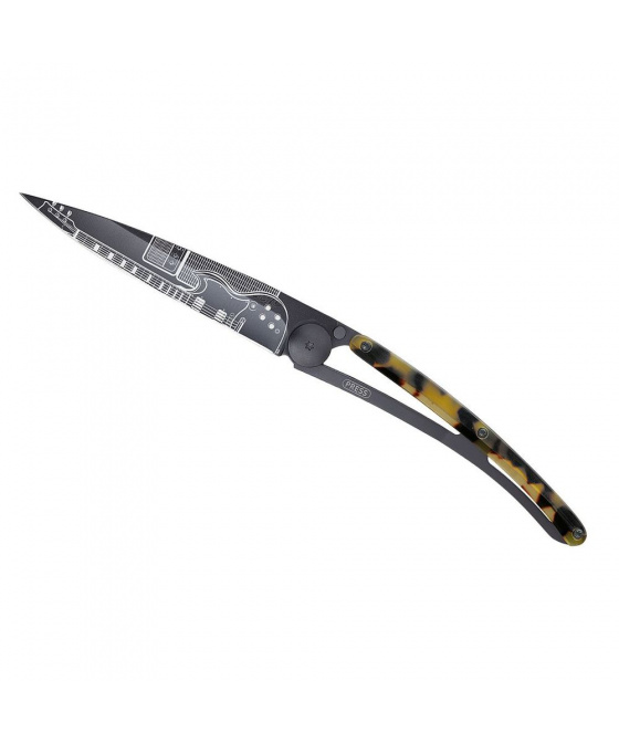 Stylový ultralehký nůž Deejo z kolekce Turtle se střenkou ze syntetické želvoviny a tmavou čepelí s tetováním "Rock’n roll".