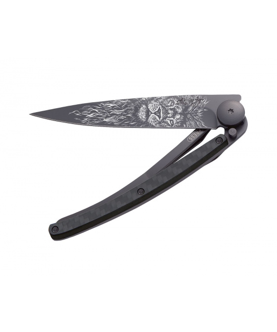 Stylový ultralehký nůž Deejo se střenkou z karbonu a tetováním lev.