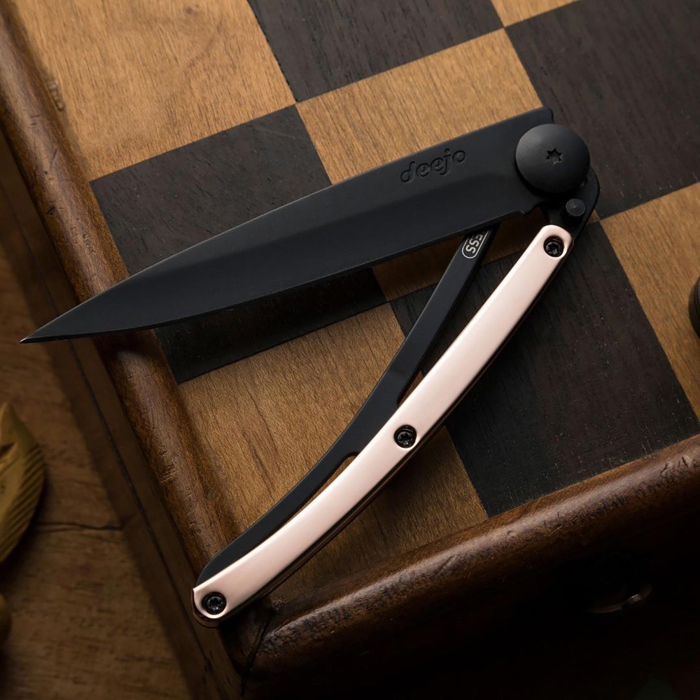 Limitovaná edice nože Deejo s rukojetí pokovenou 18-ti karátovým růžovým zlatem.