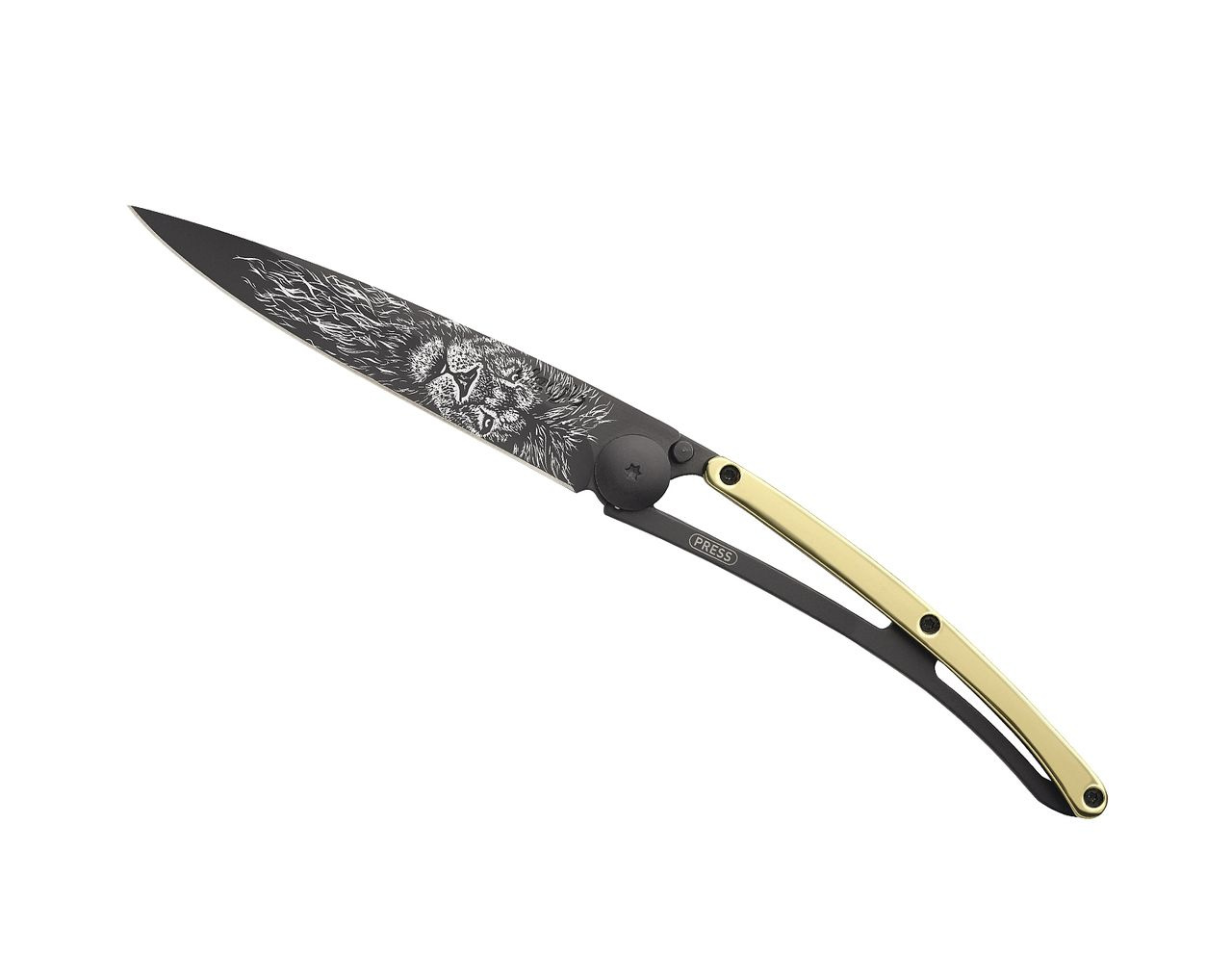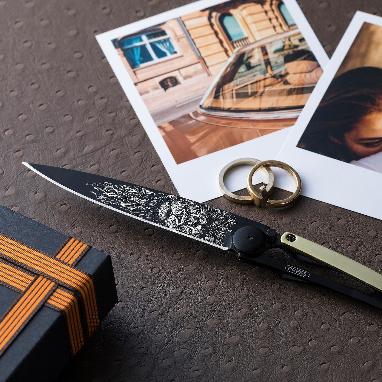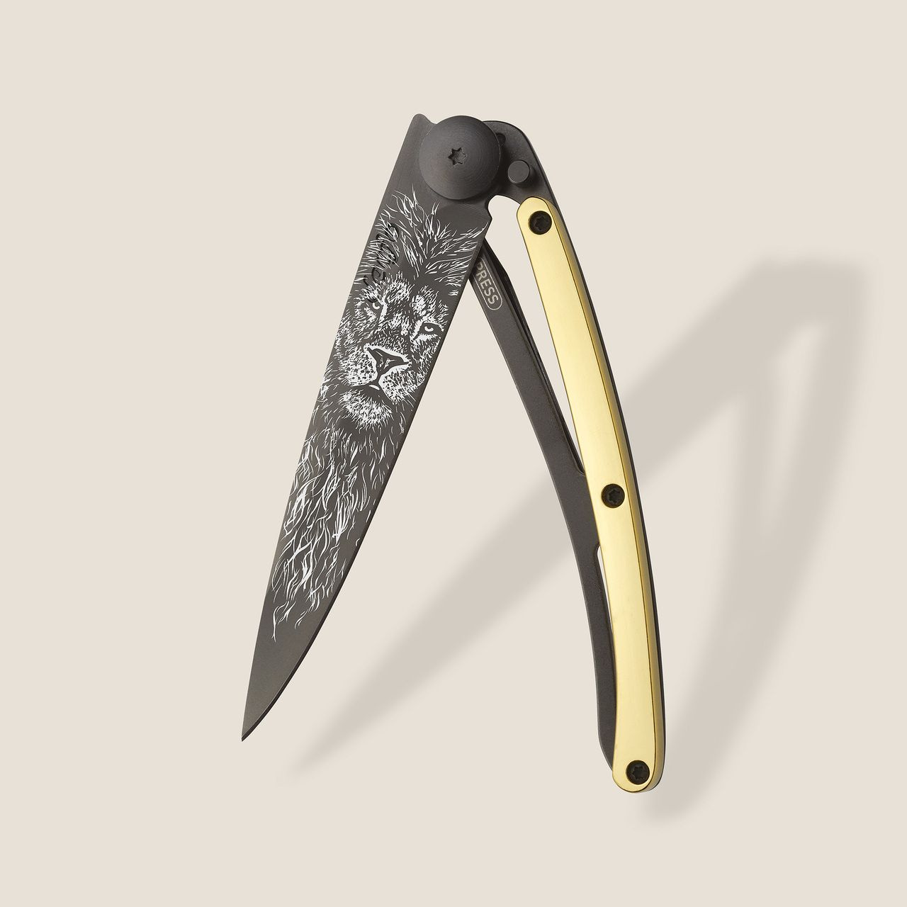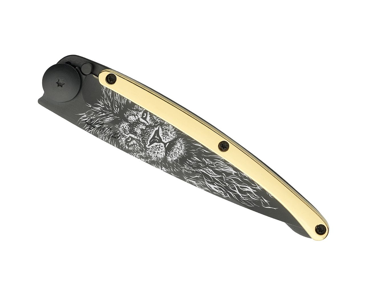 Popis Kapesní nůž Deejo 1GM022 GOLD Tattoo Black 37g 23kt yellow gold Lion