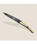 Limitovaná edice nože Deejo s rukojetí pokovenou pravým 23-karátovým zlatem a tetovanou čepelí.