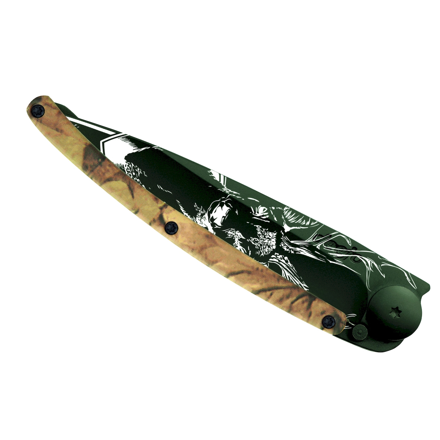 Stylový ultralehký nůž Deejo s hliníkovou střenkou s hydrografickým potiskem a elegantní černou čepelí s tetováním "jelen".