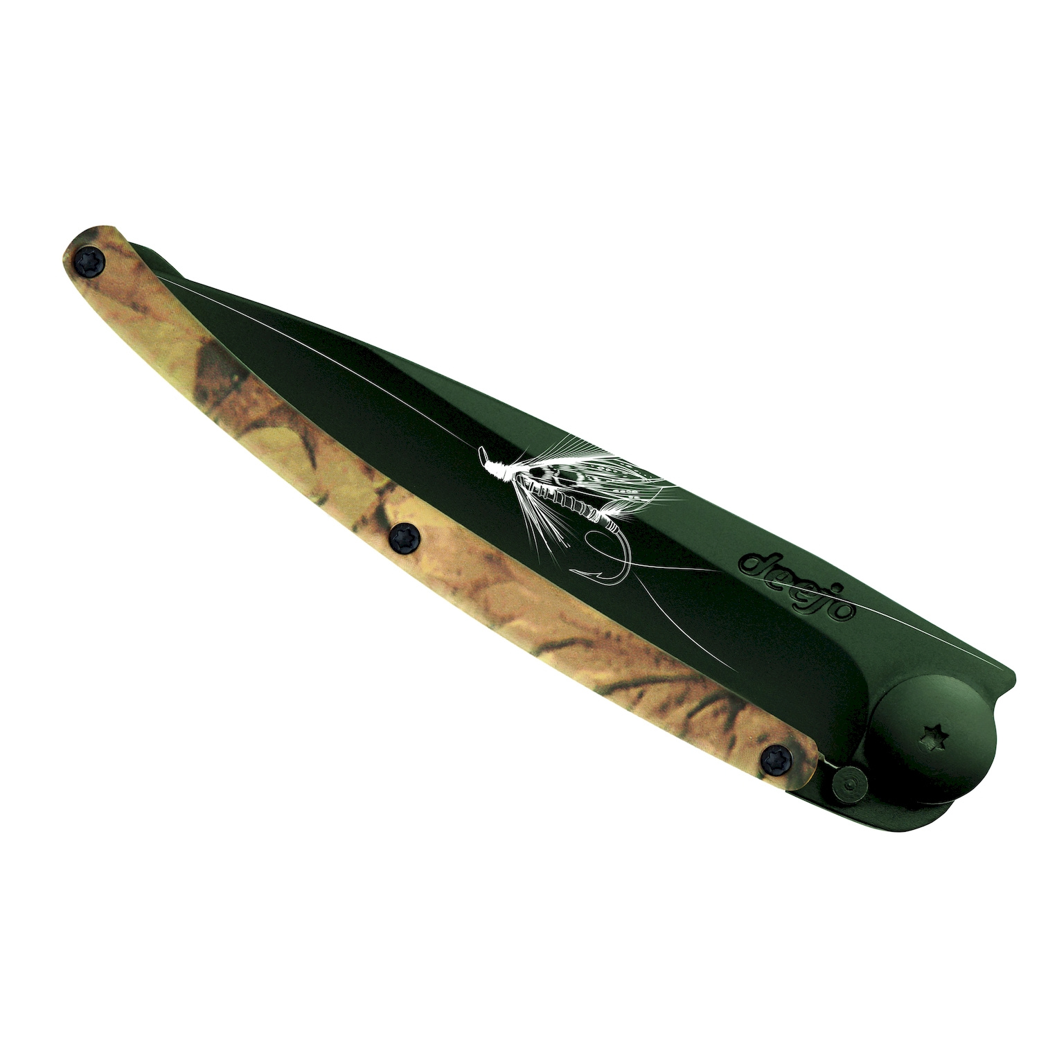 Stylový ultralehký nůž Deejo s hliníkovou střenkou s hydrografickým potiskem a elegantní černou čepeVíce