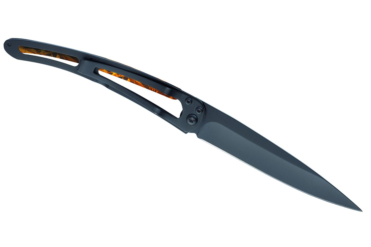 Stylový ultralehký nůž Deejo s hliníkovou střenkou s hydrografickým potiskem a elegantní černou čepe