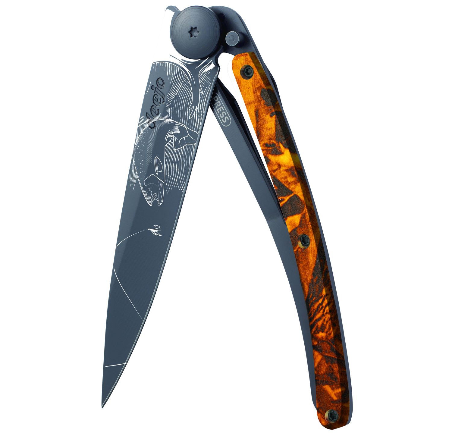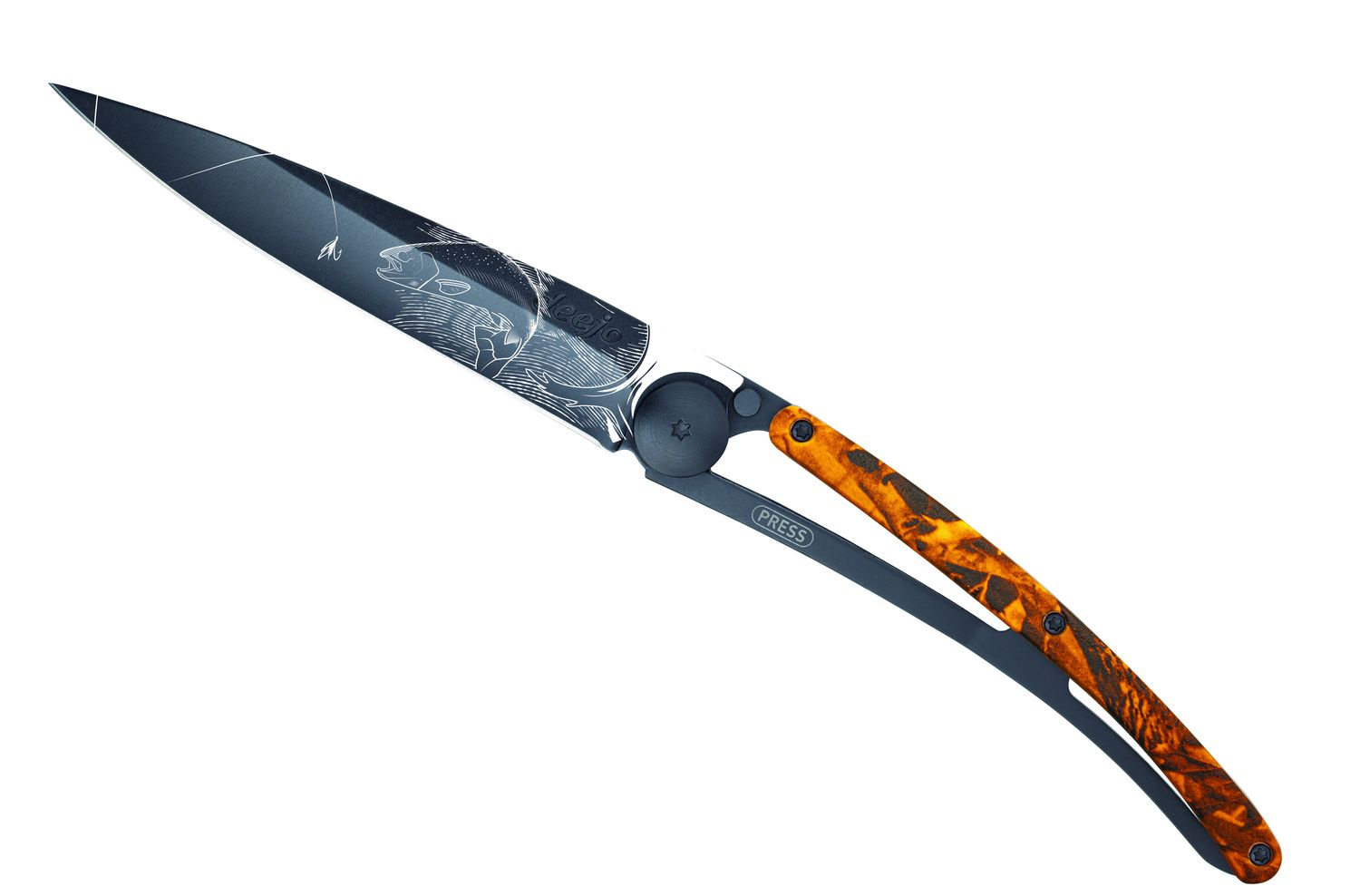 Stylový ultralehký nůž Deejo s hliníkovou střenkou s hydrografickým potiskem a elegantní černou čepe