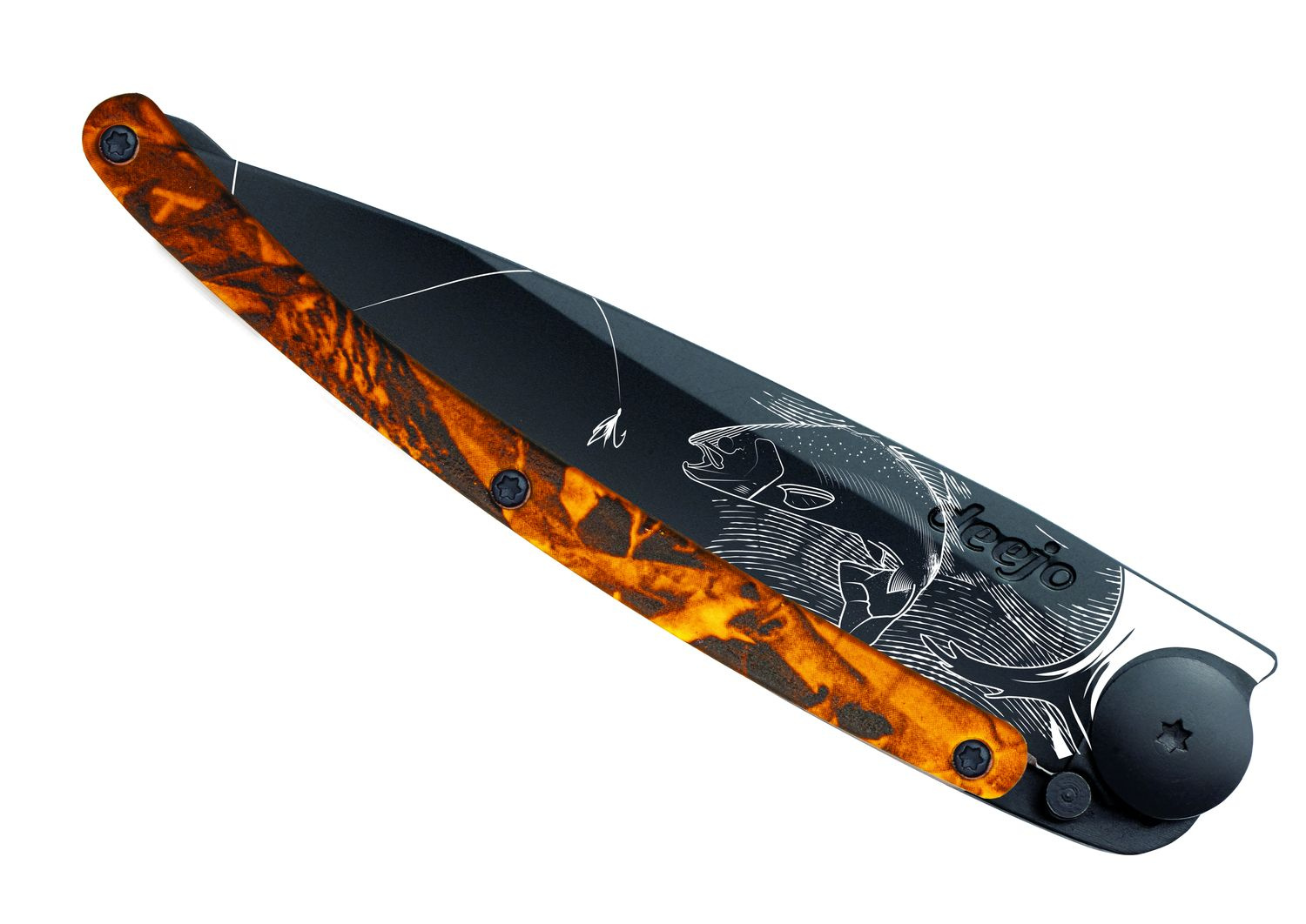 Stylový ultralehký nůž Deejo s hliníkovou střenkou s hydrografickým potiskem a elegantní černou čepelí s tetováním "pstruh".