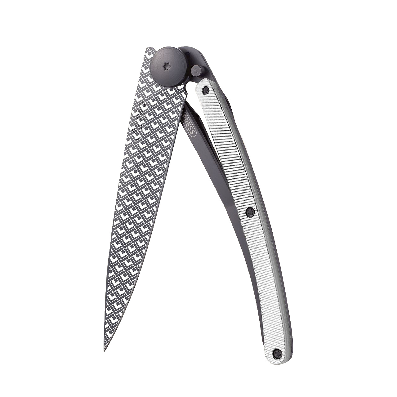 Stylový ultralehký nůž Deejo se střenkou z hliníku a motivem Quadratic.