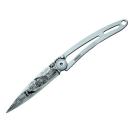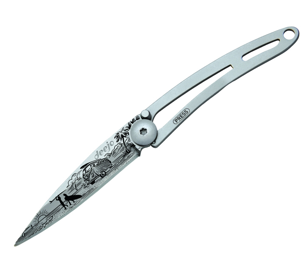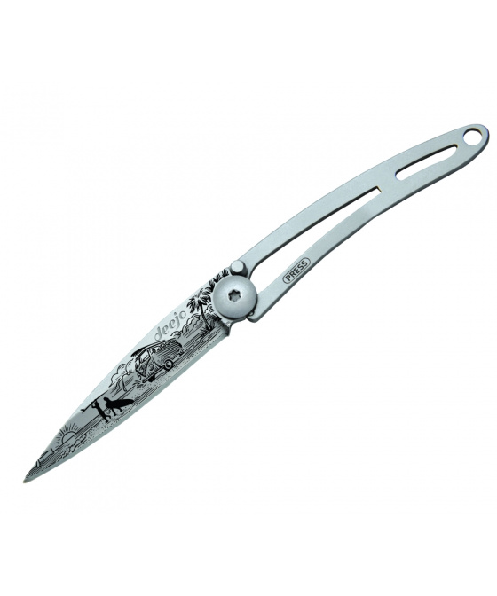 Stylový ultralehký nůž Deejo ze série Naked ve verzi 15 gramů a laserem vytetovaným motivem karavanu