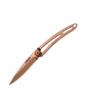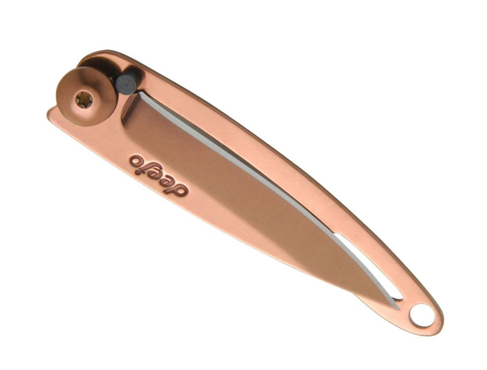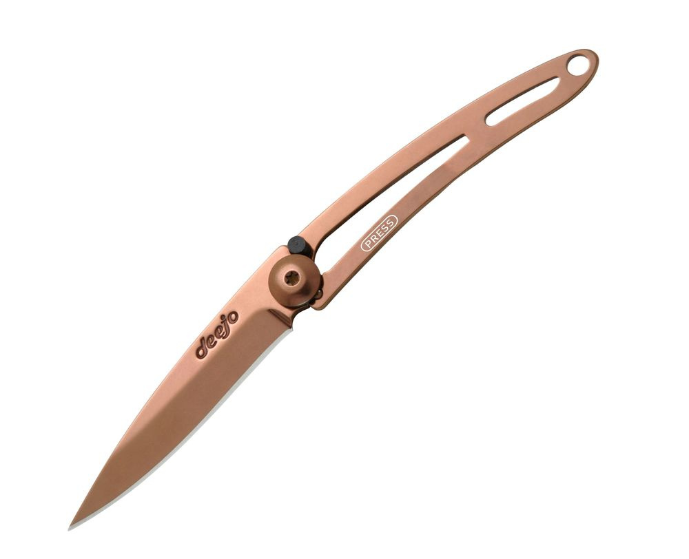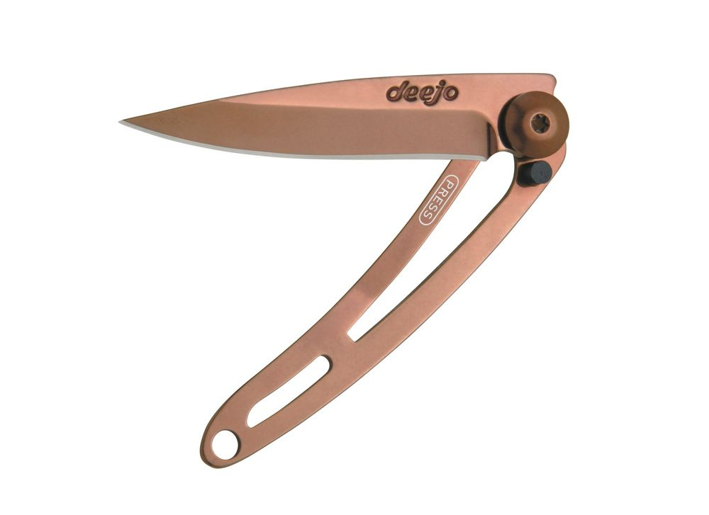 Stylový ultralehký nůž Deejo ze série Naked ve verzi 15 gramů s lesklým povrchem v barvě červené mědi.