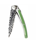 Stylový ultralehký nůž Deejo o hmotnosti 27 gramů se zelenou barvou střenky a motivem "příroda&