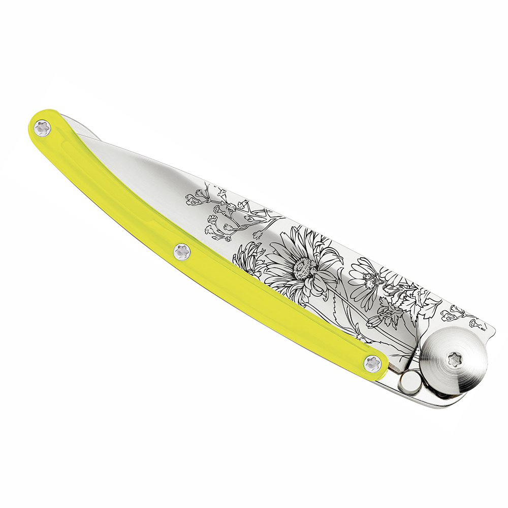 Stylový ultralehký nůž Deejo o hmotnosti 27 gramů s žlutou barvou střenky a motivem "květina&qu