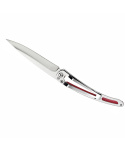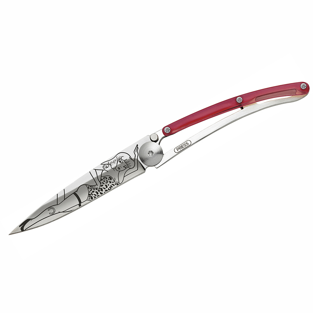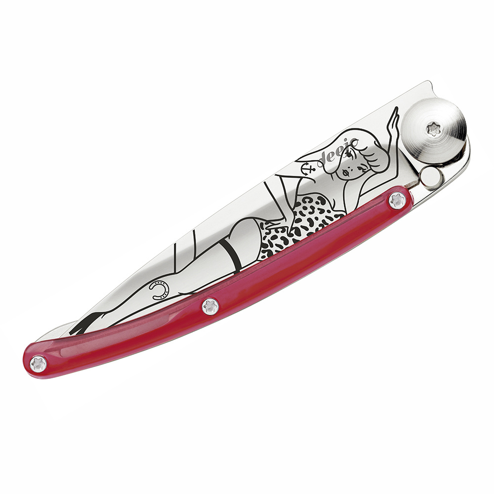 Stylový ultralehký nůž Deejo o hmotnosti 27 gramů s červenou barvou střenky a motivem "pin´up"