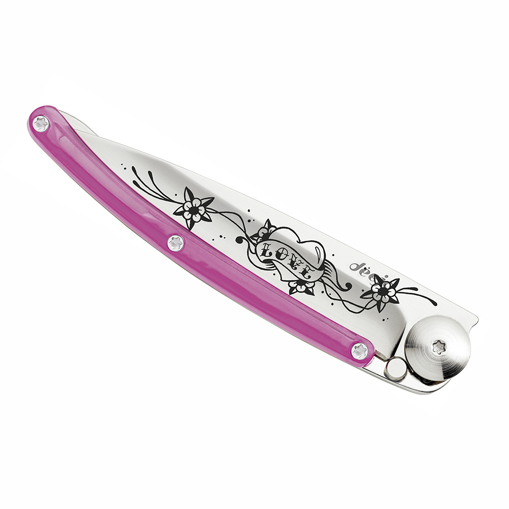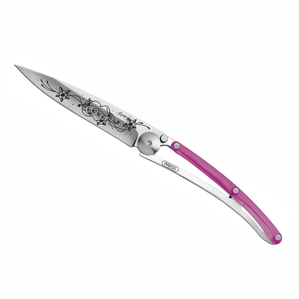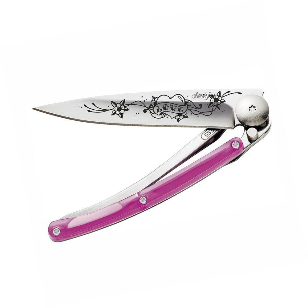 Stylový ultralehký nůž Deejo o hmotnosti 27 gramů s růžovou barvou střenky a motivem "láska"