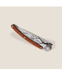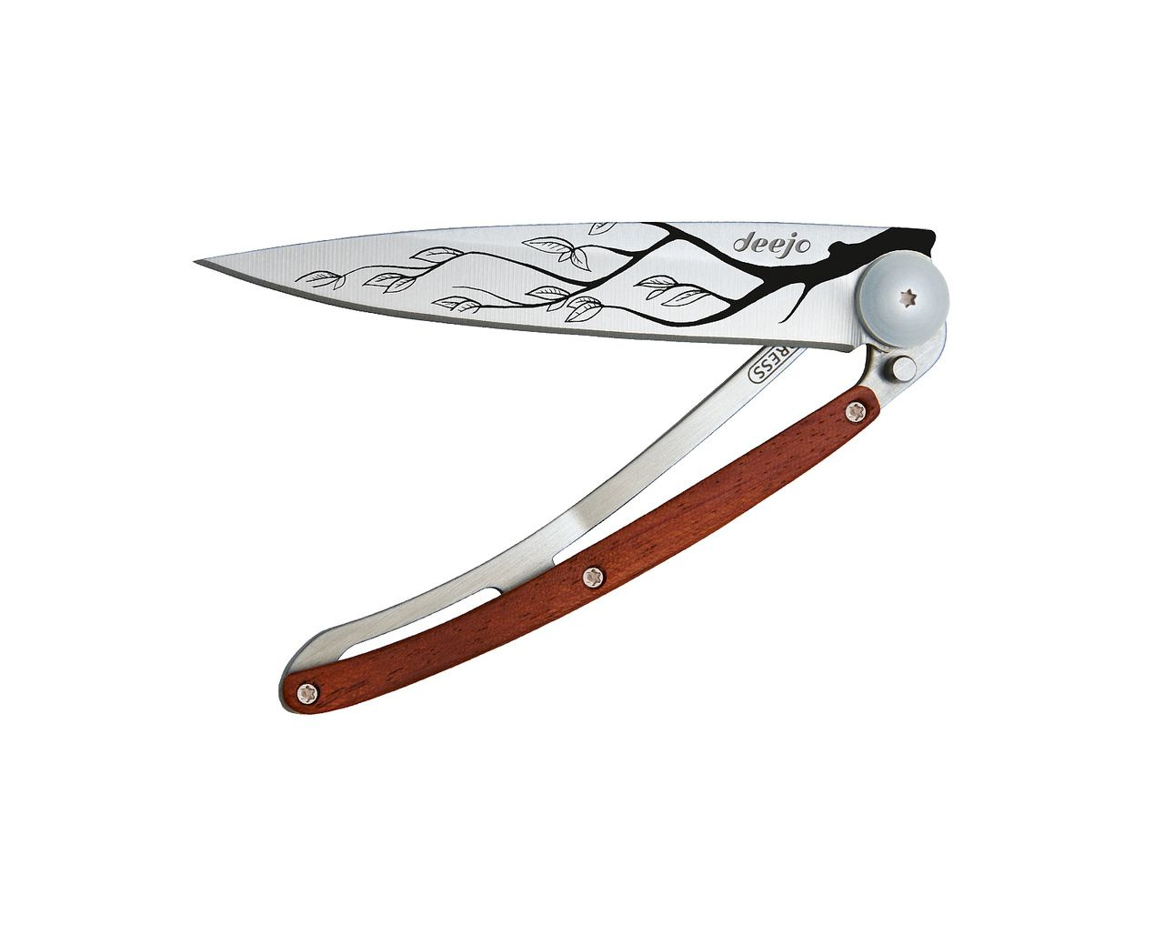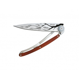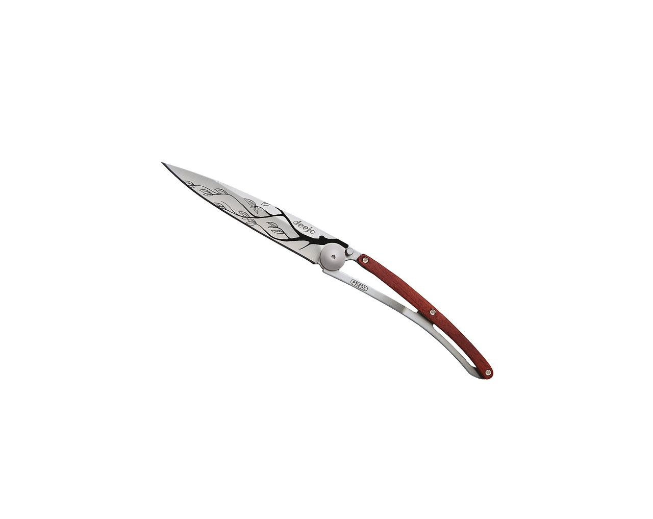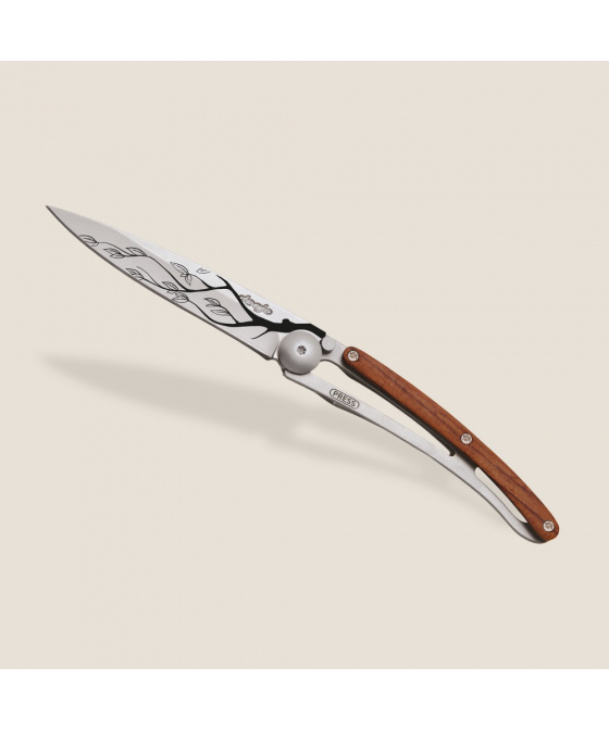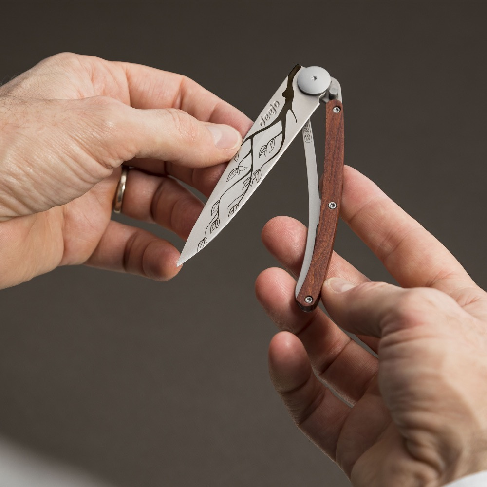 Stylový ultralehký nůž Deejo o hmotnosti 27 gramů se střenkou z dřeva coralwood a tetováním větve stromu.