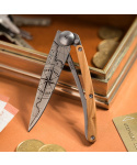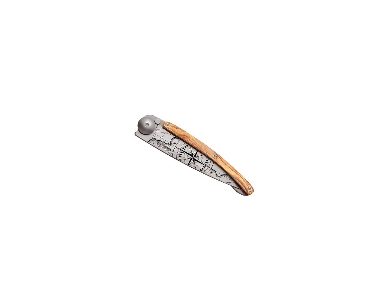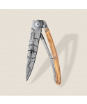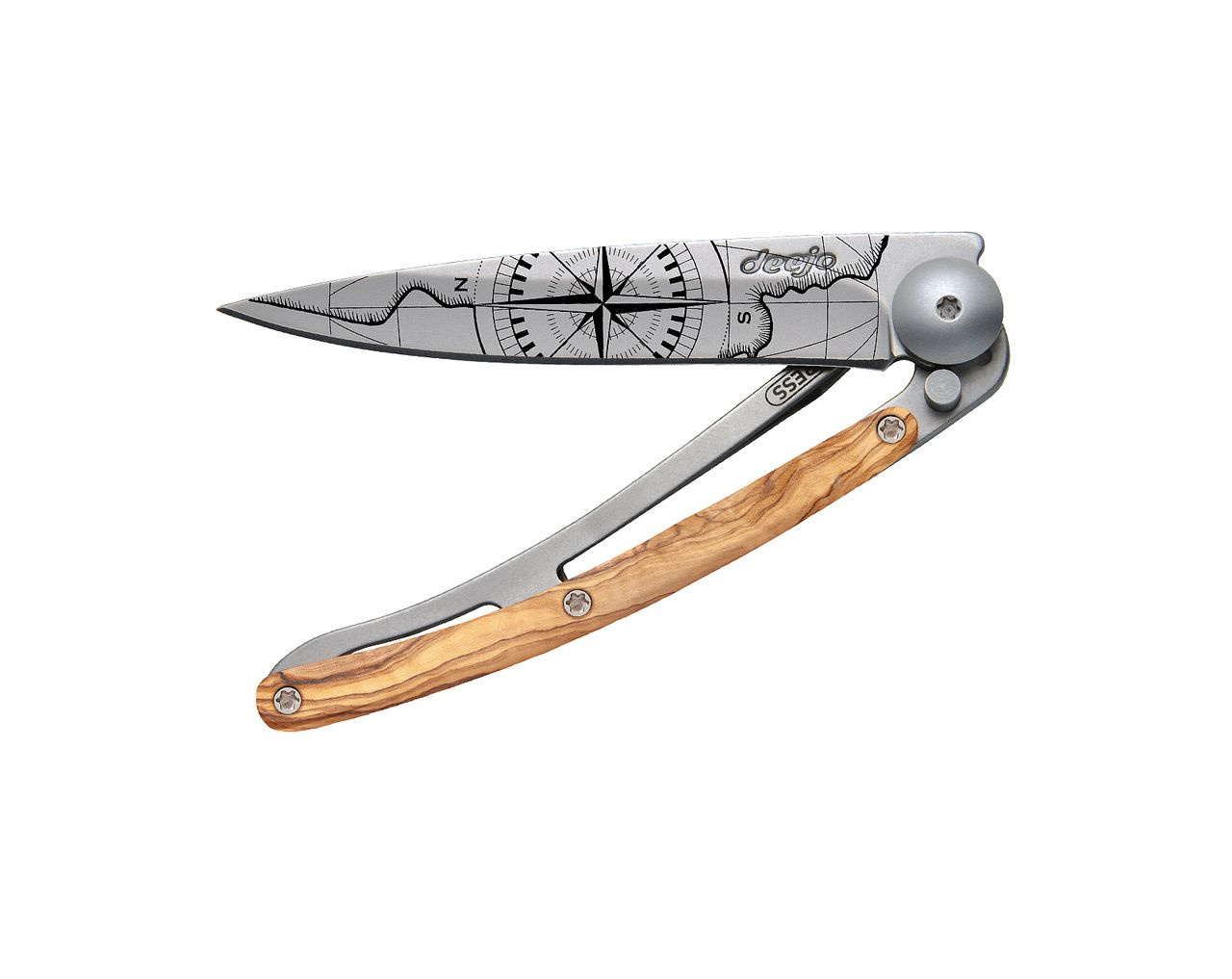 Stylový ultralehký nůž Deejo o hmotnosti 27 gramů se střenkou olivového dřeva a tetováním "země neznámá".