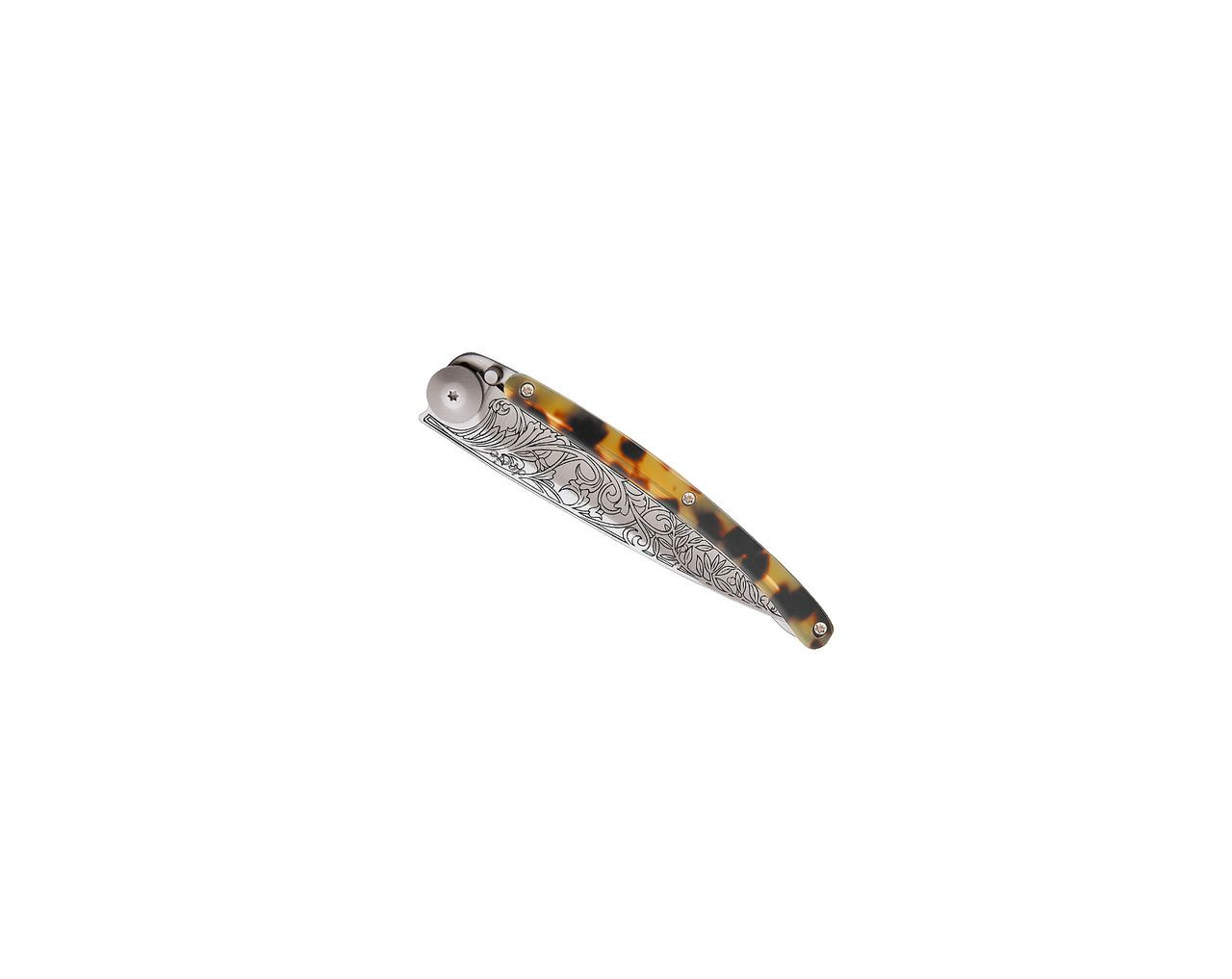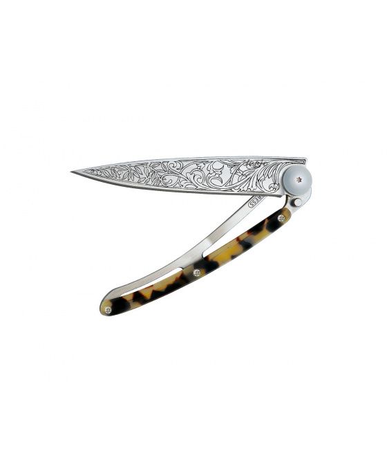 Stylový ultralehký nůž Deejo o hmotnosti 27 gramů se střenkou ze syntetické želvoviny a tetováním &q