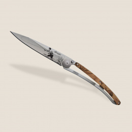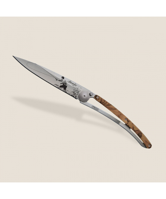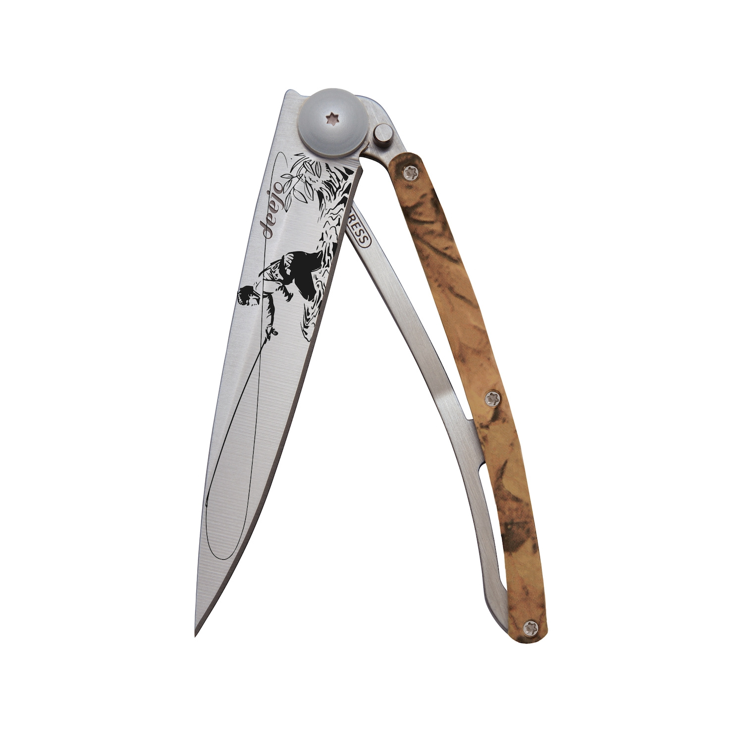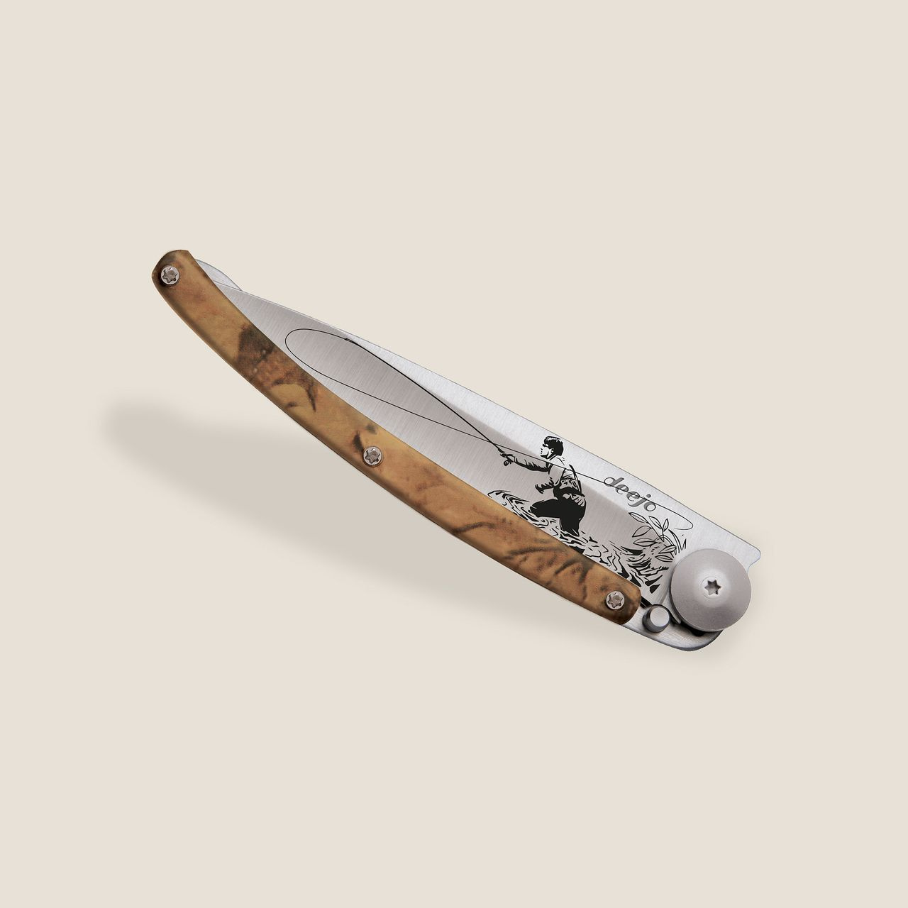 Stylový ultralehký nůž Deejo o hmotnosti 27 gramů s hliníkovou střenkou s hydrografickým potiskem a tetováním "muškaření".