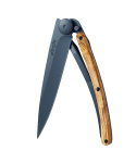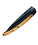 Stylový ultralehký nůž Deejo se střenkou z olivového dřeva a elegantní černou čepelí.