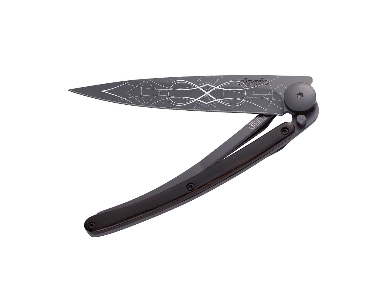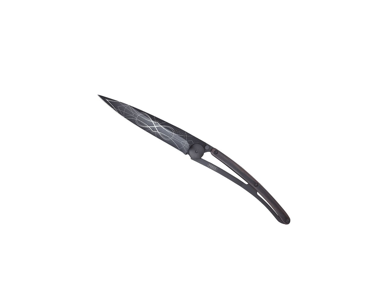 Stylový ultralehký nůž Deejo se střenkou z ebenového dřeva a elegantní černou čepelí s tetováním "nekonečno".
