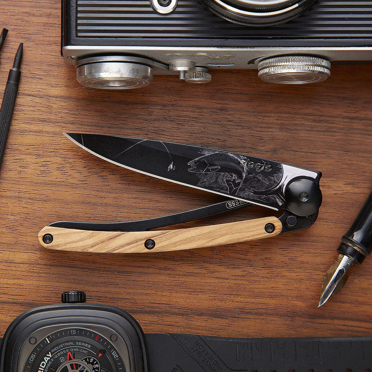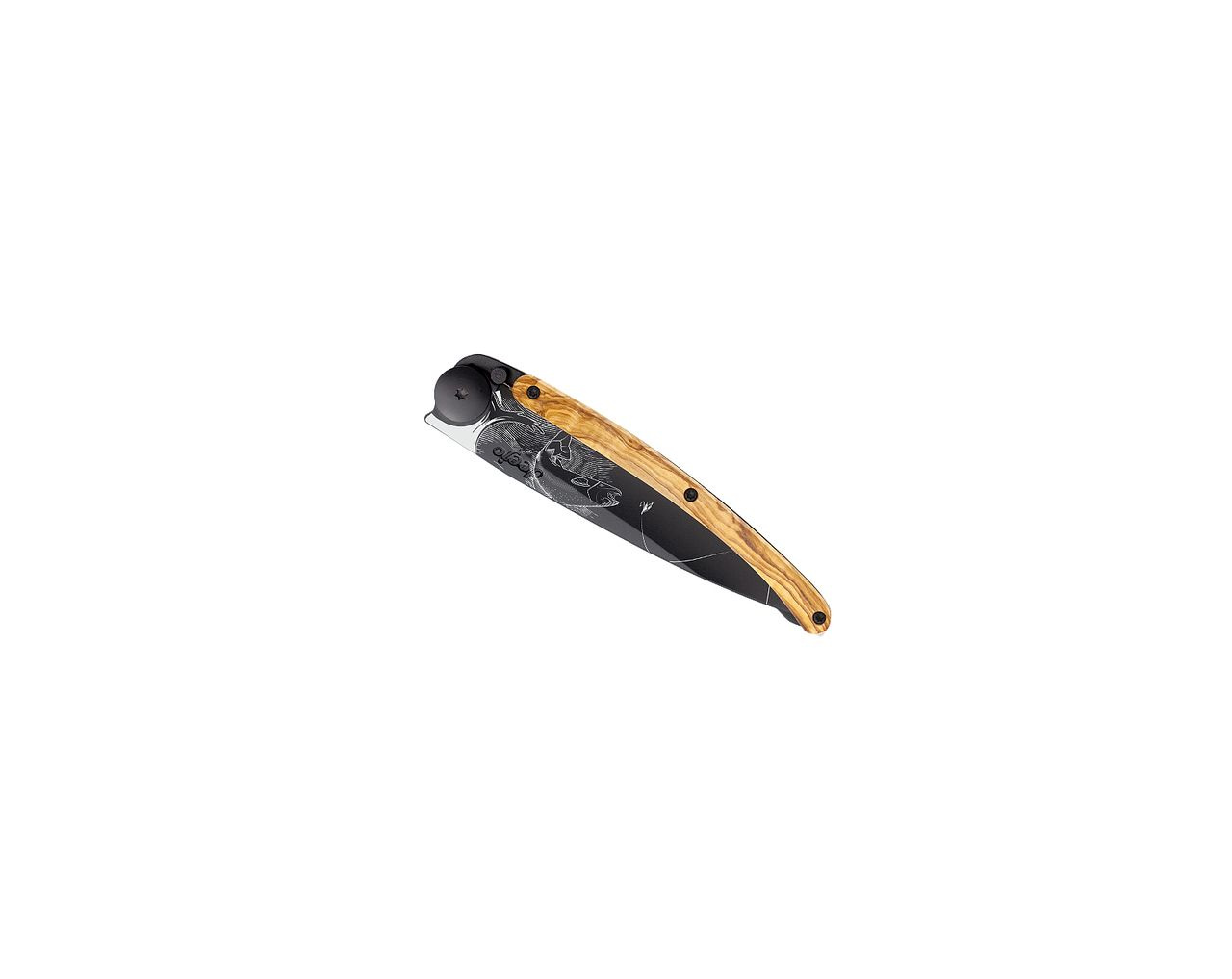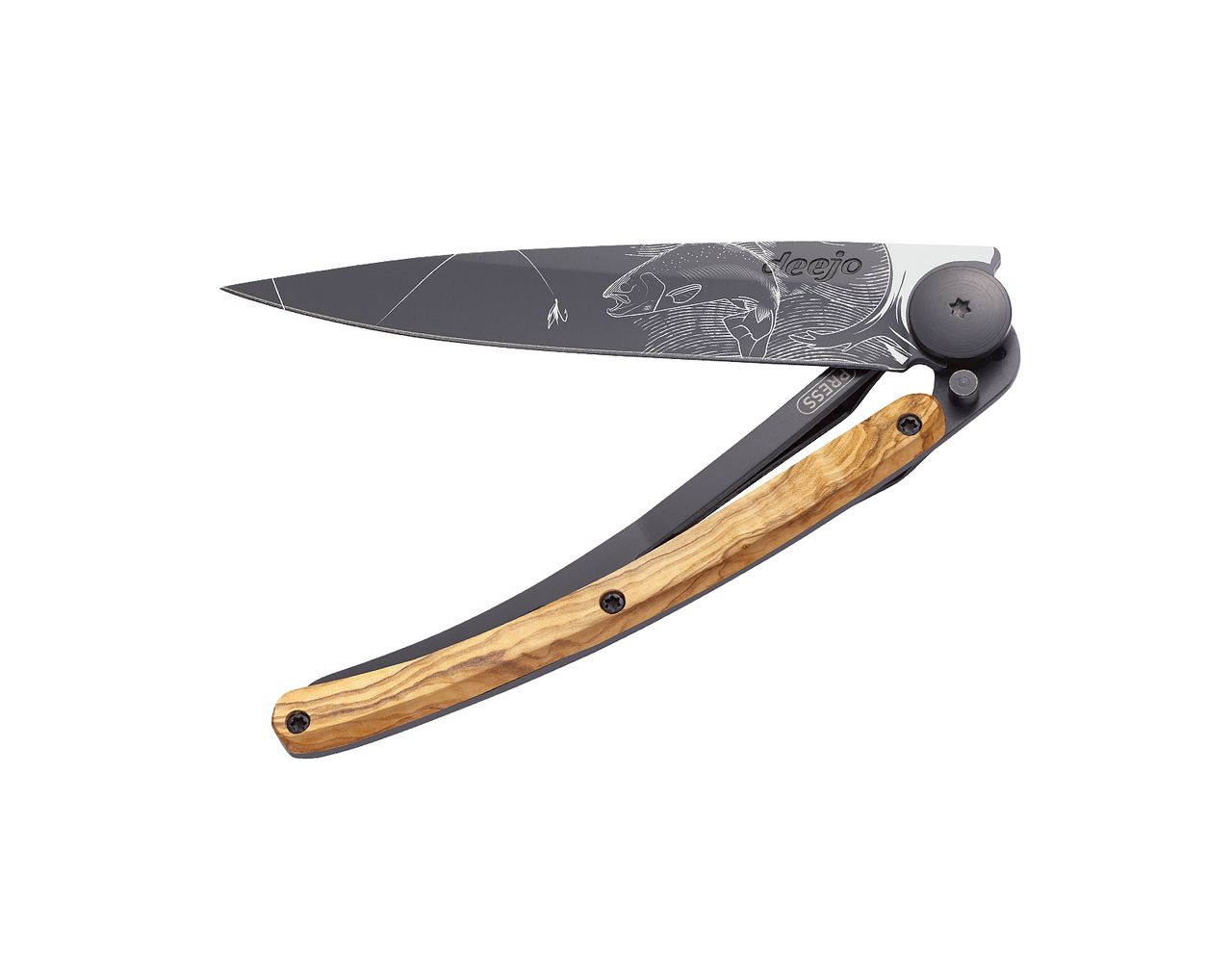 Stylový ultralehký nůž Deejo se střenkou z olivového dřeva a elegantní černou čepelí s tetováním "pstruh".