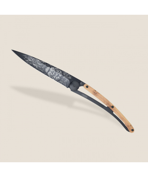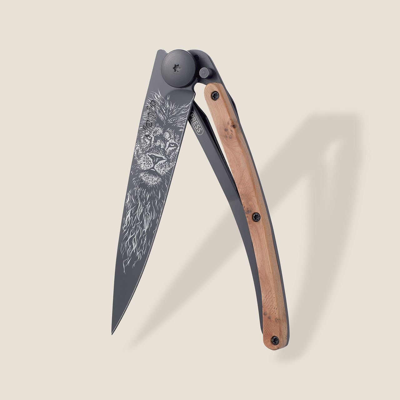 Stylový ultralehký nůž Deejo se střenkou z kořene exotického jalovce a elegantní černou čepelí s tetováním "lev".