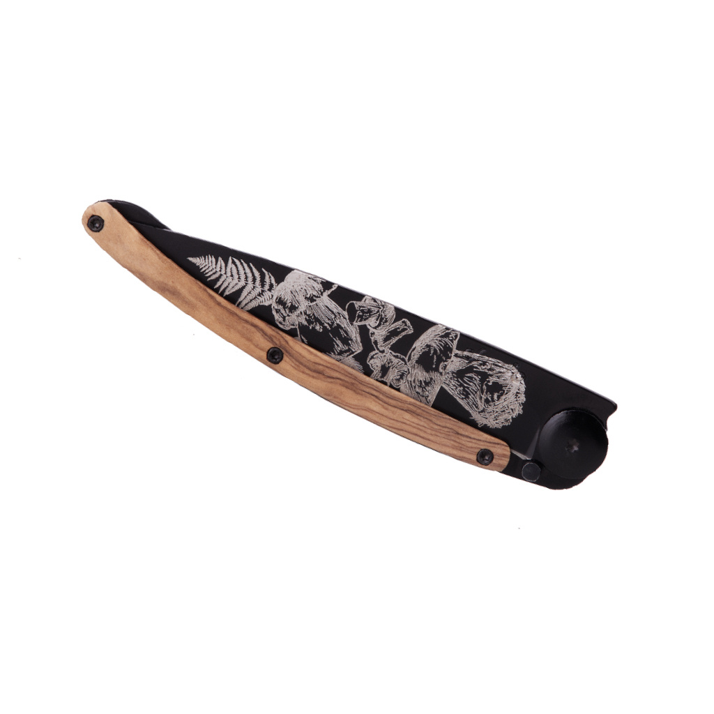 Stylový ultralehký nůž Deejo se střenkou z olivového dřeva a houbařským motivem.