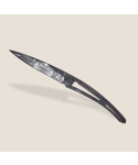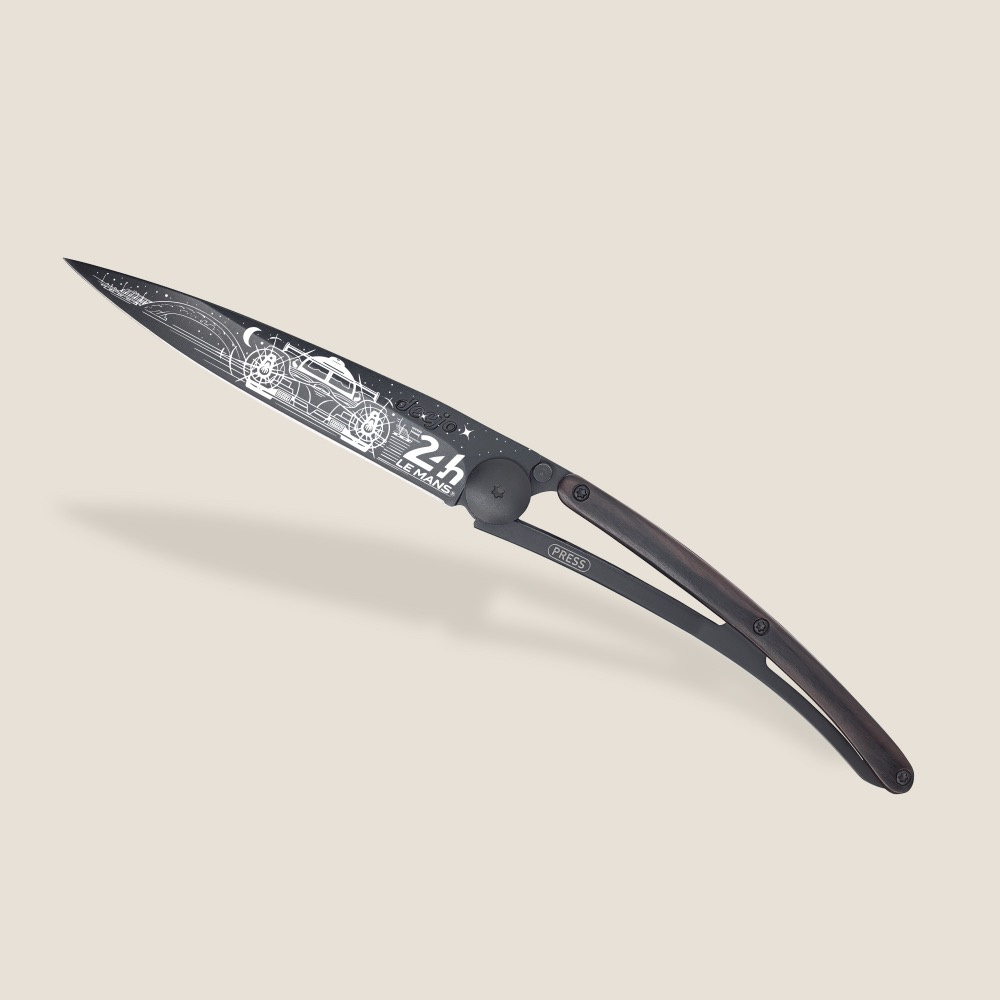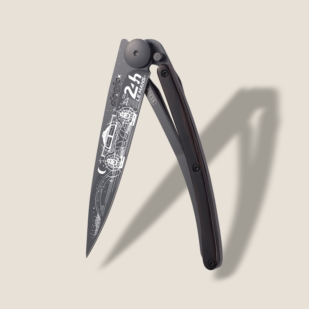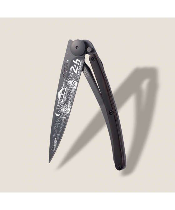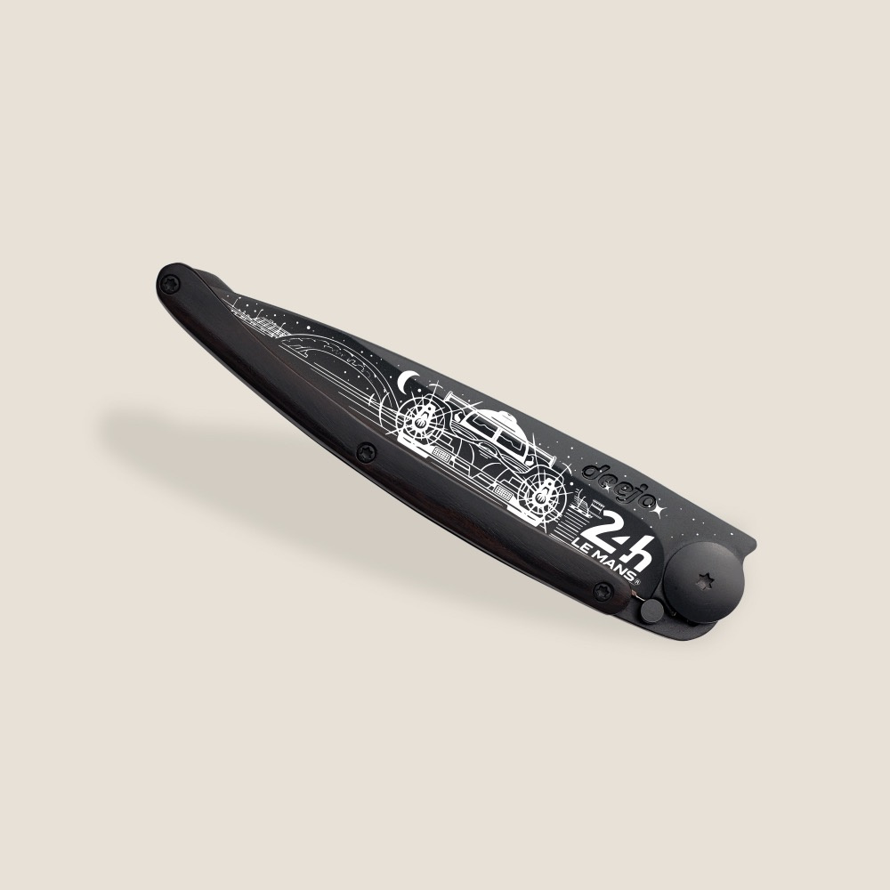 Stylový ultralehký nůž Deejo z edice 24h Le Mans se střenkou z ebenového dřeva a černou čepelí s motivem Night.