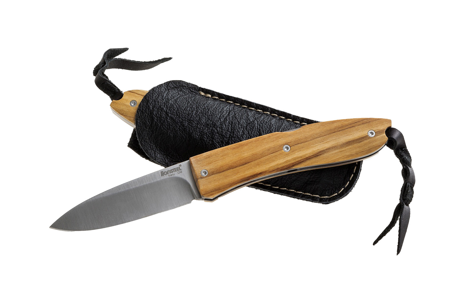 Kapesní nůž s čepelí z ocele D2 a dřevěnou rukojetí. Dodáváno s koženým pouzdrem