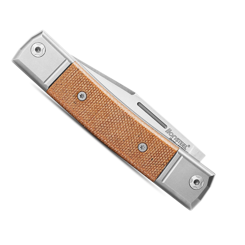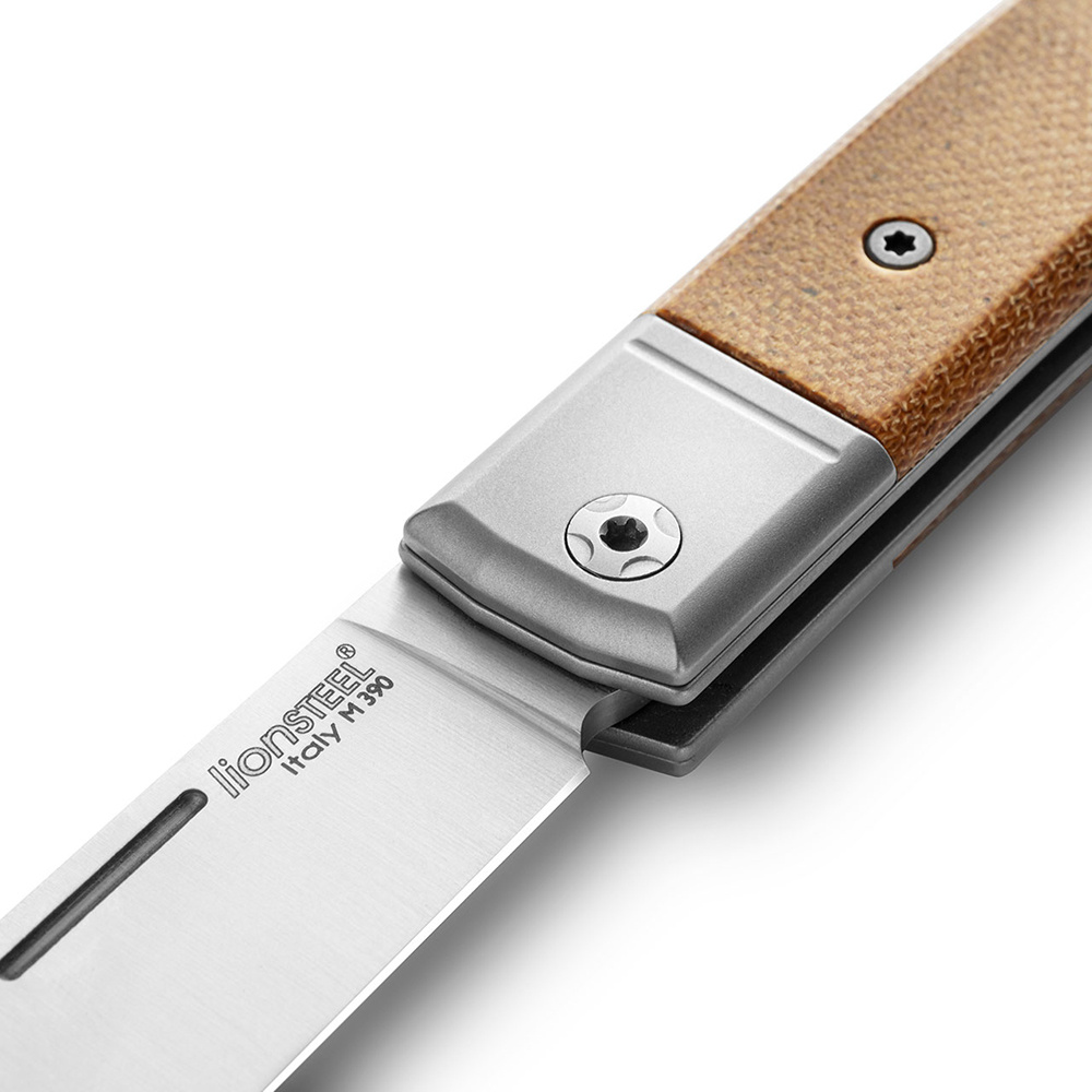 BestMAN s jedinou čepelí z ocele M390 a rukojetí z micarty světle hnědé barvy.