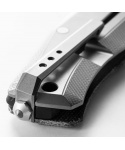 Myto je hi-tech EDC zavírací nůž s čepelí z ocele M390 a rukojetí z černého canvasu, Součástí je klip na opasek a rozbíječ skla.