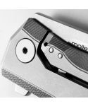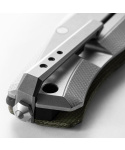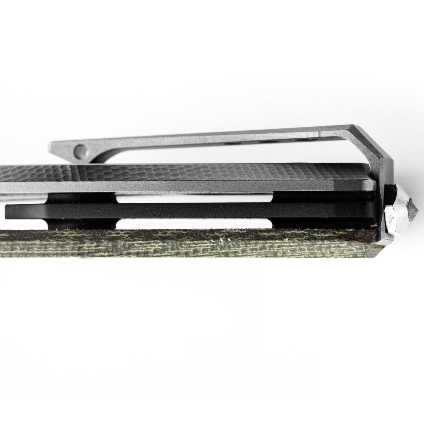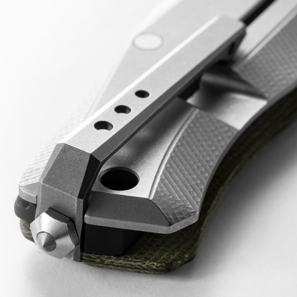 Myto je hi-tech EDC zavírací nůž s čepelí z ocele M390 a rukojetí z voděodolného zeleného canvasu a s klipem na opasek a rozbíječem skla.