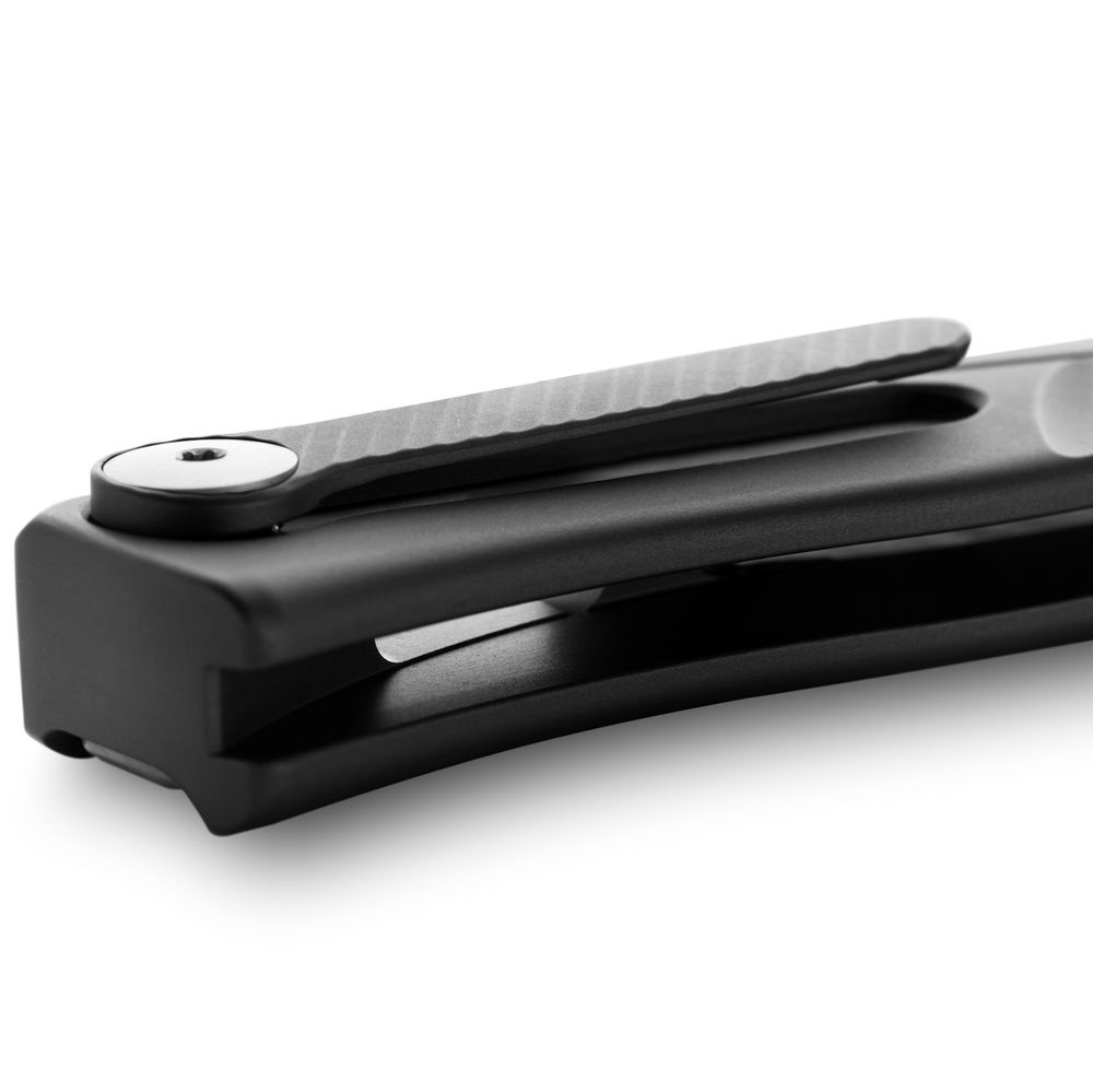Kapesní nůž s rukojetí z masivního hliníku, čepelí z odolné ocele M390 a skrytým klipem na opasek.