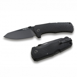 Velmi robustní kapesní nůž s černou čepelí a rukojetí z uhlíkového vlákna.