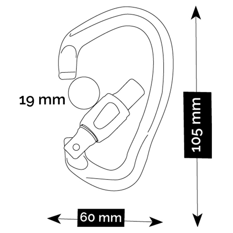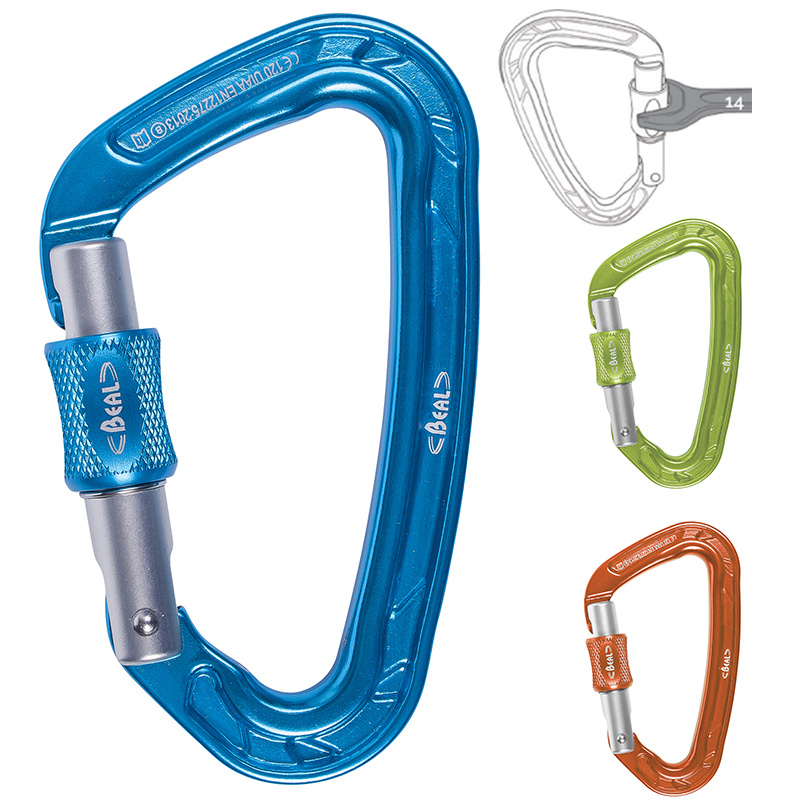 Asymetrická „D“ keylocková karabina se šroubovací pojistkou zámku, upravenou pro pevné dotažení klíčem (14). Karabina Be Quick je vhodná pro zajištění ve štandu.