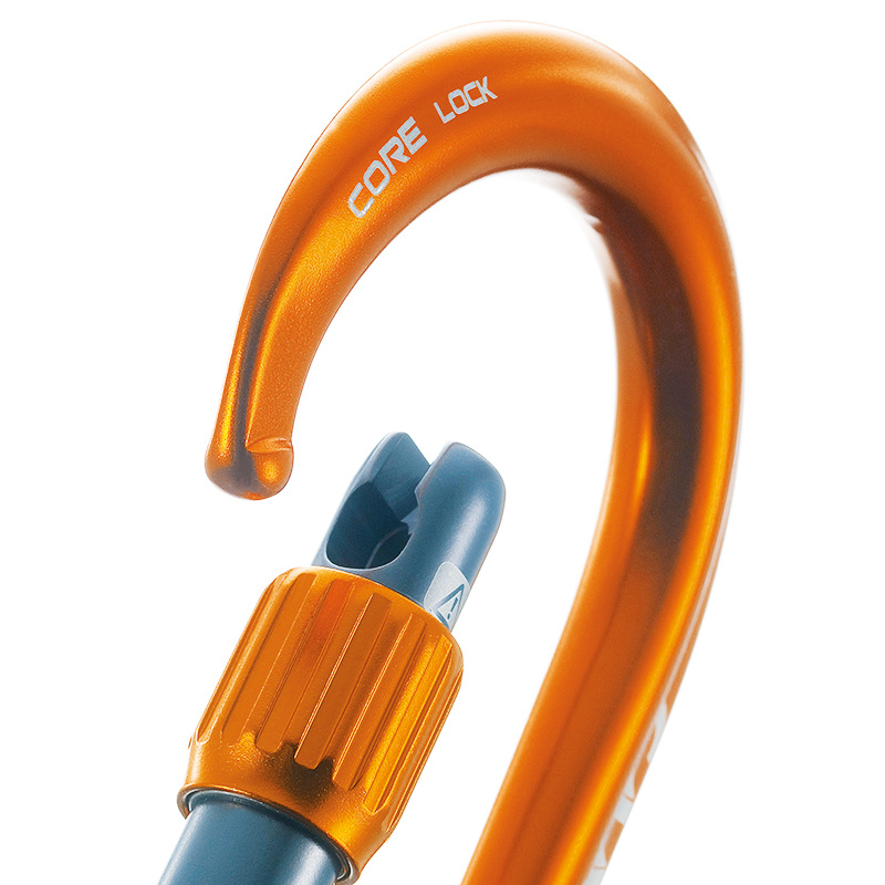 Unikátní široký tvar HMS karabiny Core Lock vyniká velkou světlostí, výbornou prostupností lana a díky nové úpravě šroubovací pojistky zámku, také maximálně jednoduchým ovládáním jednou rukou. Díky hladkému povrchu je jištění a slaňování velmi plynulé. Patentovaná úprava nosu a zámku karabiny SphereLock zaručuje ještě vyšší pevnost při zatížení. Pro zvýšení bezpečnosti je zámek karabiny opatřen laserovým výbrusem, který značí, je-li pojistka zámku dostatečně zašroubována.