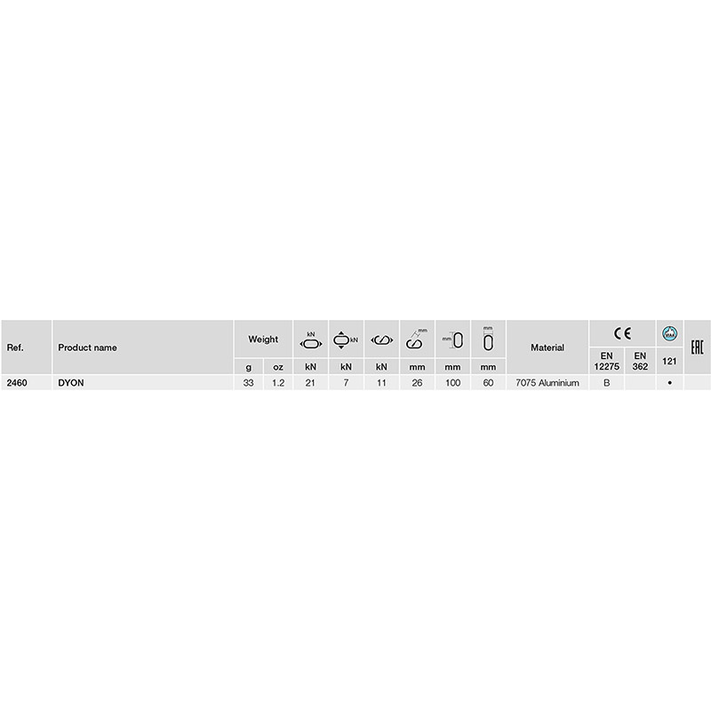 Dyon „D“ karabina je dalším krokem vpřed v evoluci karabin. Dyon používá patentovaný vlastní design drátového zámku KeyWire, který kombinuje výhody plynulé činnosti drátového zámku s uzávěrem zámku. Tato jedinečná kombinace poskytuje vysokou úroveň samotného provedení i bezpečnosti.