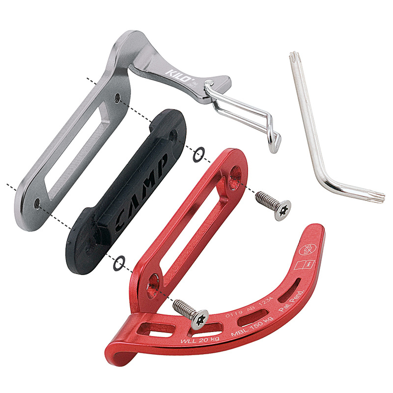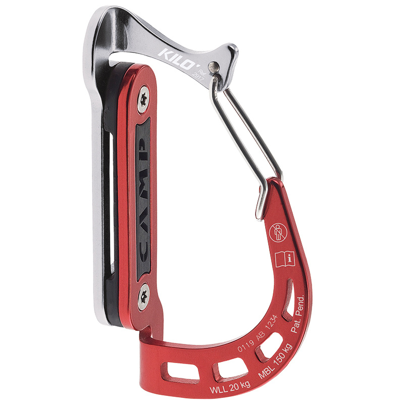 Kilo je pomocná karabina, určená pro zavěšení pracovních nástrojů a vybavení na pracovní postroj. Díky specifickému tvaru je velmi pevná, stabilní a umožňuje jednoduchou obsluhu. Tělo karabiny je tvořeno dvěma částmi, vyrobenými z hliníkové slitiny, které jsou spojeny nerezovými TH20 torx šrouby pro snadnou a rychlou instalaci. Vrchní část karabiny umožňuje „parkování“ vybavení pro případ, že budete mít zavěšeno více nástrojů najednou. Plastová vložka je uzpůsobena pro instalaci na popruhy postroje až do šířky 45mm. Drátový zámek z nerezové oceli je tvarován tak, aby umožňoval komfortní obsluhu a zároveň nedocházelo k náhodnému otevření či zachycení. TH20 torx klíč je součástí balení.