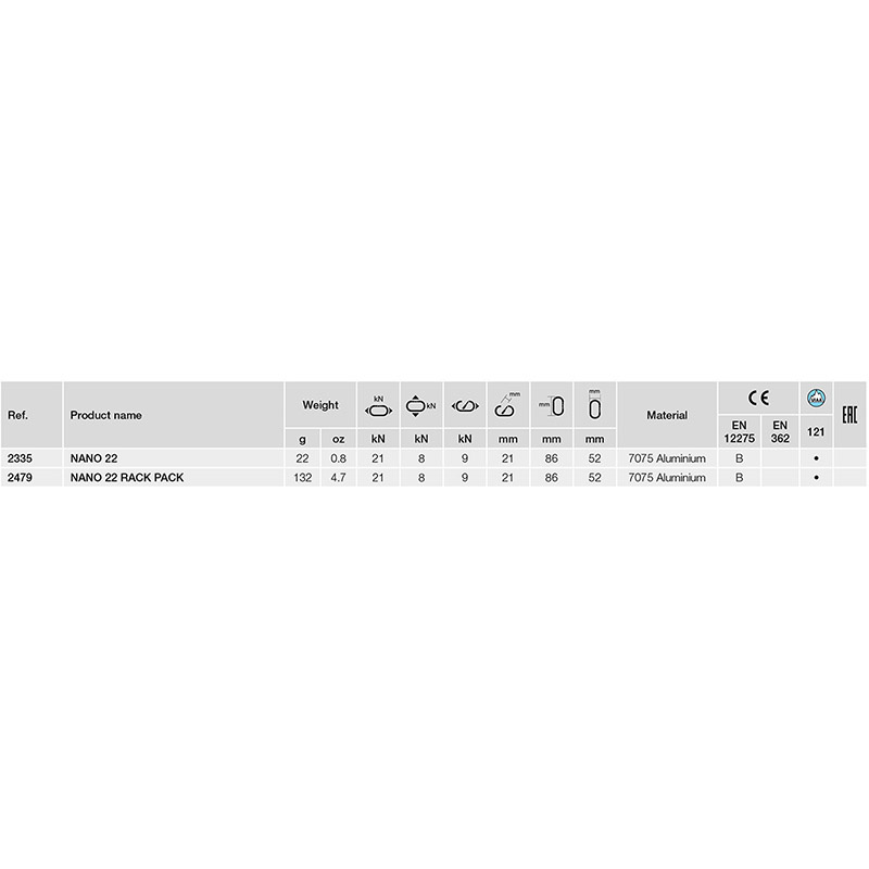 Nano 22 je jednou z nejlehčí karabin na světě. Je nositelem několika ocenění a ukazuje neustálý pokrok společnosti CAMP, která i tuto karabinu dokázala ještě vylepšit. V návaznosti na populární Nano Wire a Nano 23 je Nano 22 ještě lehčí, silnější a funkčnější. Nano 22 má speciální design, který je ve všech třech pevnostních stupních silnější o 1 kN. S hmotností 22g je Nano 22 nejlehčí plně funkční karabina na trhu s jedinečnými parametry, které ji odlišují od ostatních menších karabin. Nabízí dostatečně velký vnitřní prostor pro práci s lanem jakéhokoliv průměru.