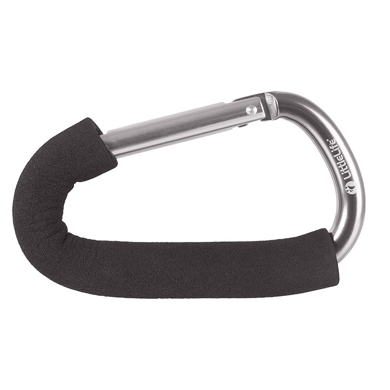 Buggy Clip je hliníková karabina s polstrováním pro zavěšení batůžku nebo čehokoliv jiného ke kočárku.