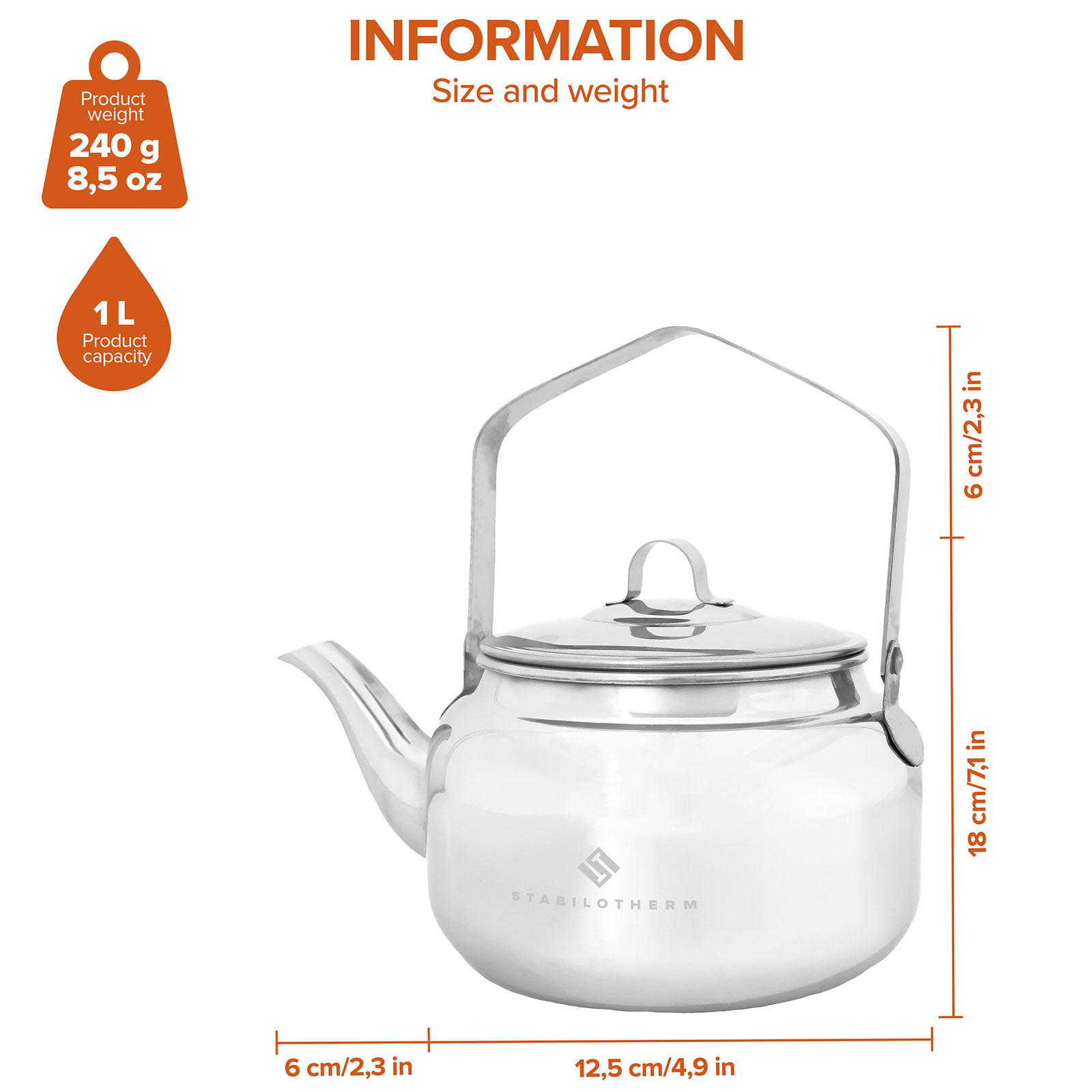 Kávová nebo čajová konvička Stabilotherm pro použití u táboráku. Konvice je kompletně vyrobena z nerezové oceli a tvar rukojeti je přizpůsoben pro zavěšení na stojan nebo závěs. Víčko má kovovou smyčku, takže můžete použít například hůl ke zvednutí horkého víčka.