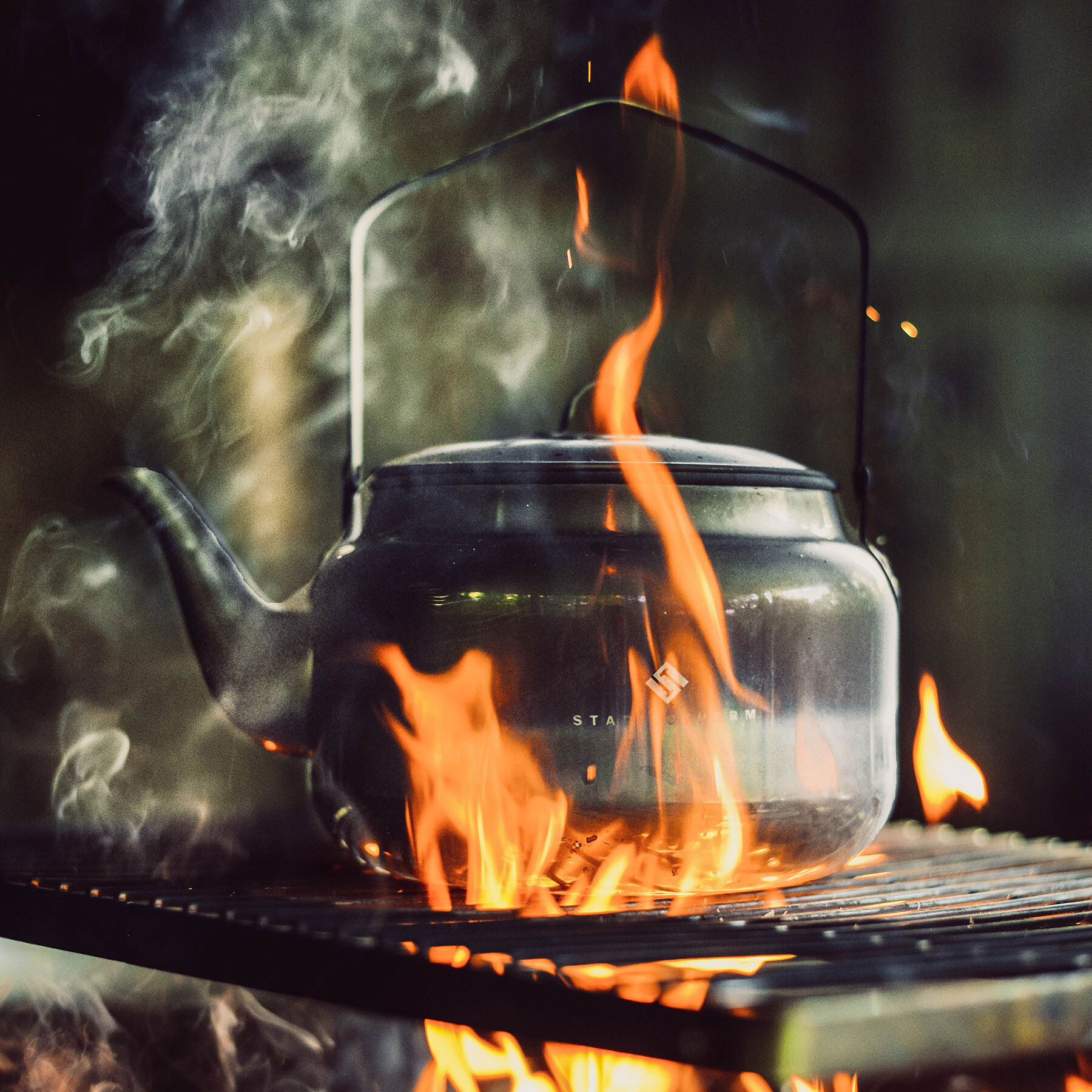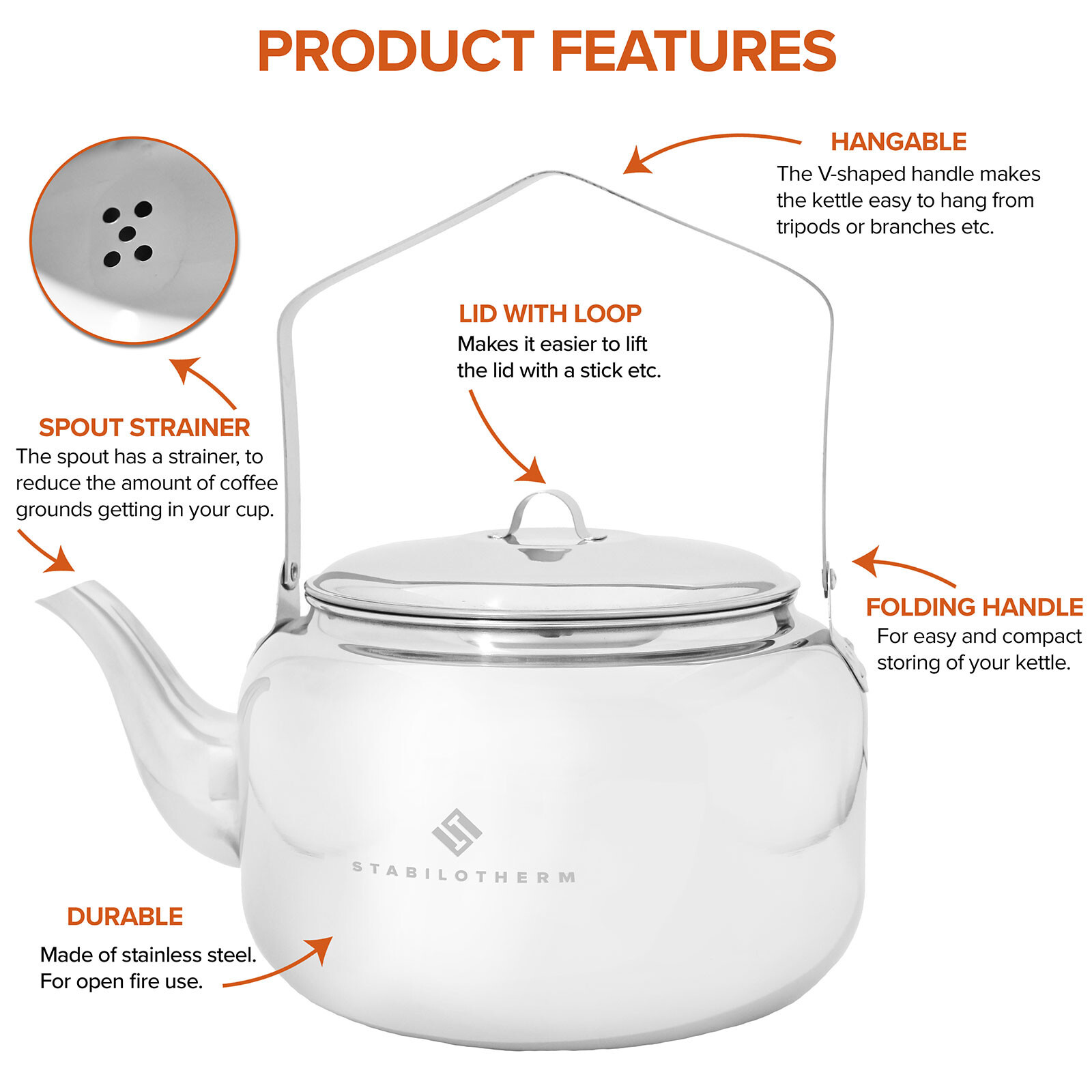 Kávová nebo čajová konvička Stabilotherm pro použití u táboráku. Konvice je kompletně vyrobena z nerezové oceli a tvar rukojeti je přizpůsoben pro zavěšení na stojan nebo závěs. Víčko má kovovou smyčku, takže můžete použít například hůl ke zvednutí horkého víčka.