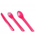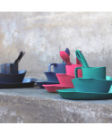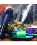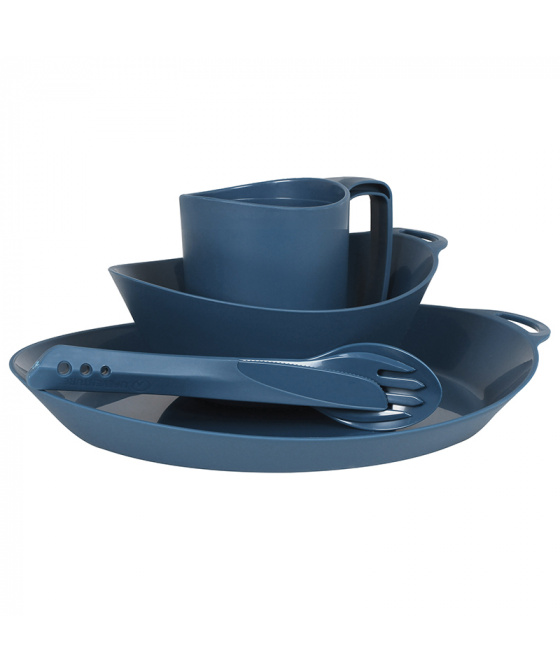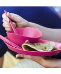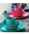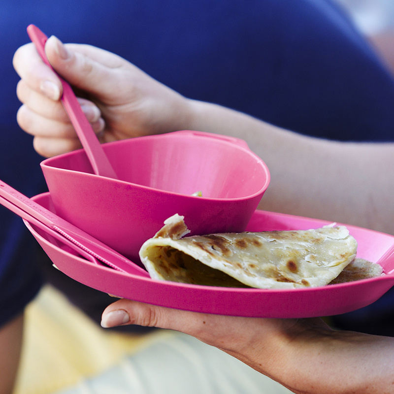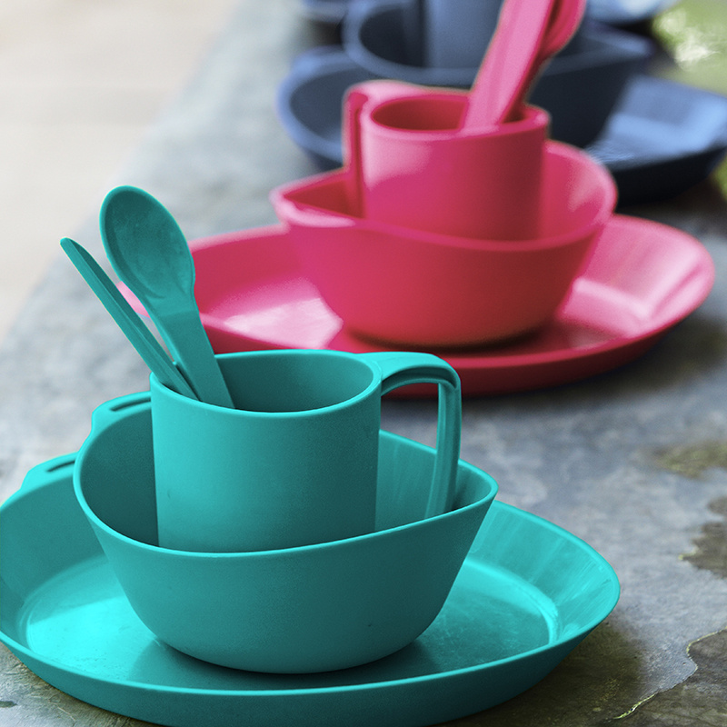 Sada talíře, misky, hrnku a příboru z lehoučkého odolného plastu. Sada je k dostání ve čtyřech barevných variantách. Materiál neobsahuje zdraví škodlivý bisfenol (BPA free). Nádobí je možné mýt v myčce a je vhodné i pro použití do mikrovlnné trouby.