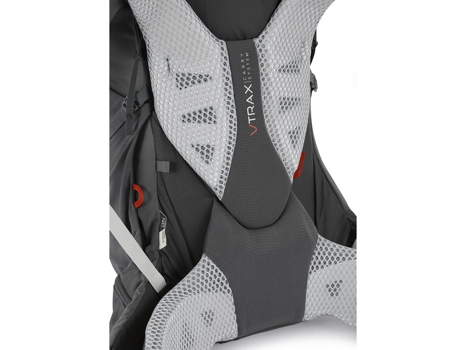 V-TRAX™ je nosný systém s nastavitelnou délkou zádového panelu pomocí suchého zipu. Společně s podpůrným bederním pásem zajišťuje plný kontakt se zády a vynikající stabilitu.