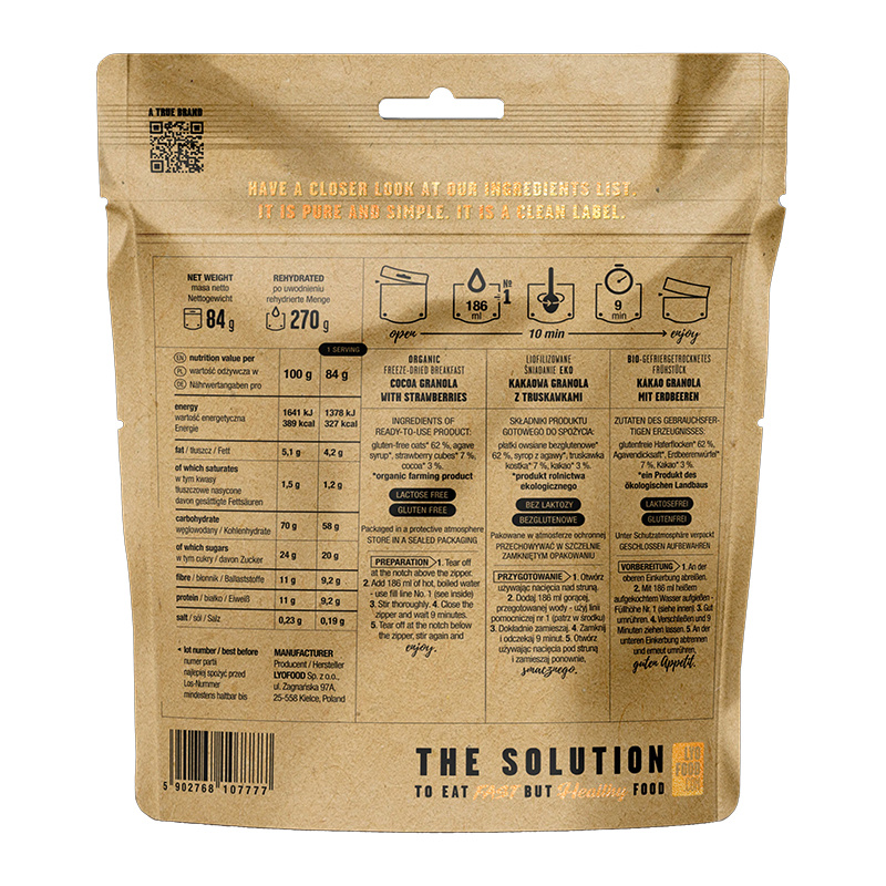 V balení nejsou žádné umělé přísady, žádné přidané cukry, žádný palmový olej a žádné konzervační látky. Jídlo je vyrobeno ze 100% přírodních surovin. Všechny suroviny jsou z ekologických farem.