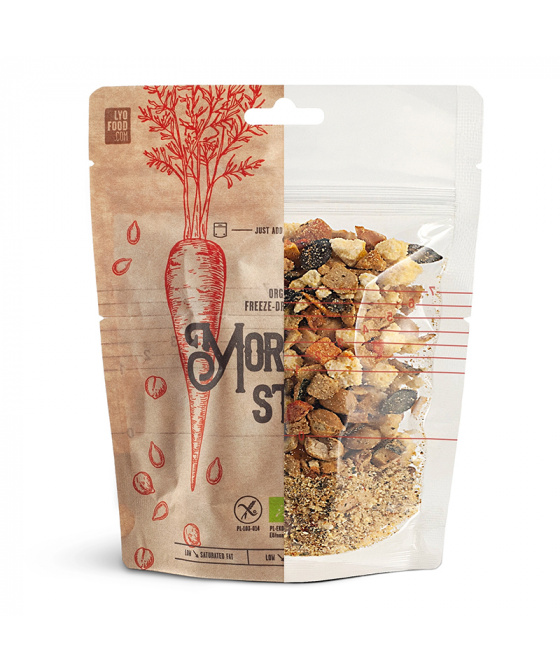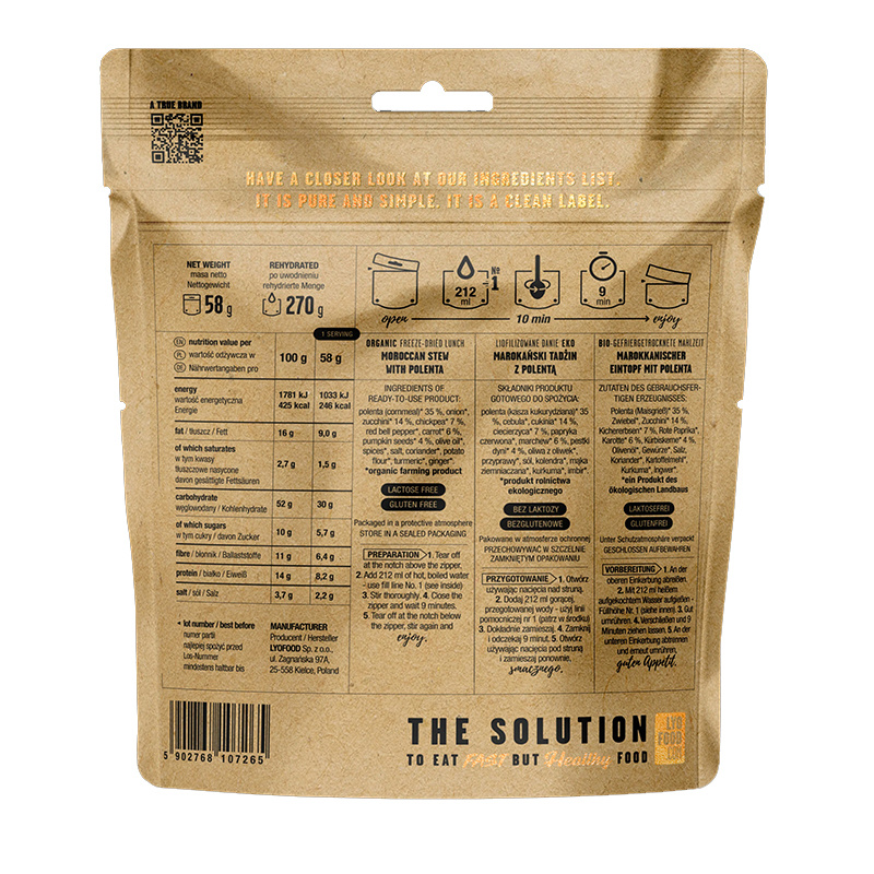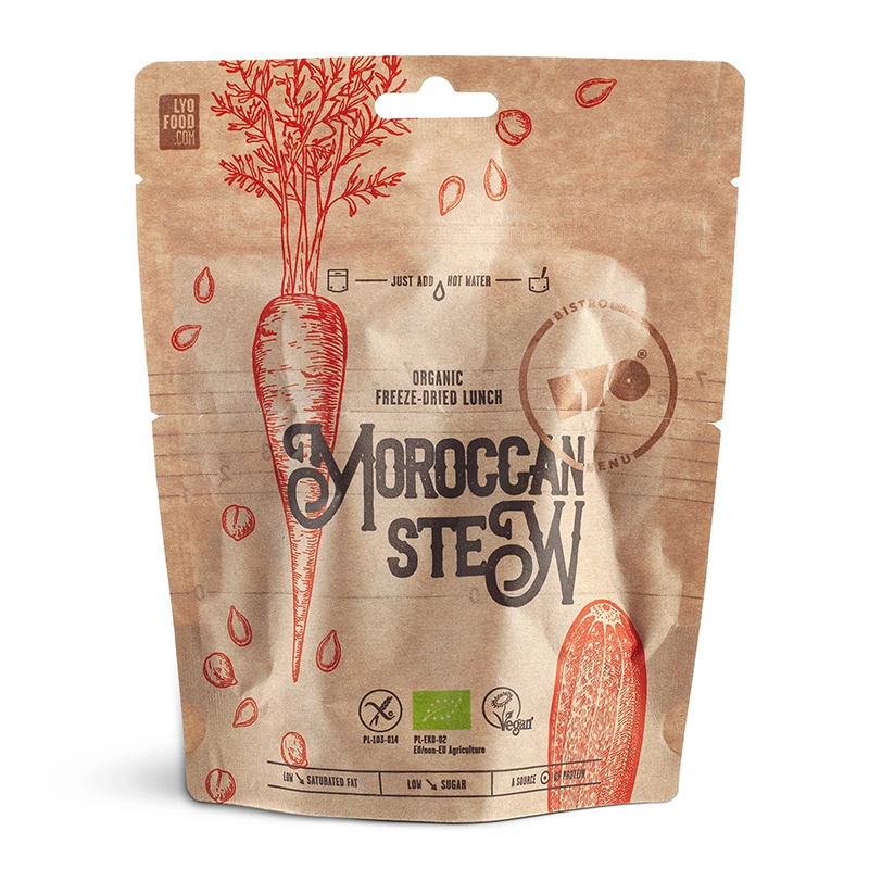 Toto celosvětově proslulé jídlo, úzce spojené s marockou kuchyní, potěší mlsné jazýčky svými bohatými a koncentrovanými chutěmi. Lyofilizovaná veganská verze tohoto marockého jídla je vyrobena z bio mrkve, cukety, papriky, dýně a cizrny a podává se s polentou. Je to lahodné, uspokojující jídlo, které si můžete vychutnat uprostřed rušného dne.