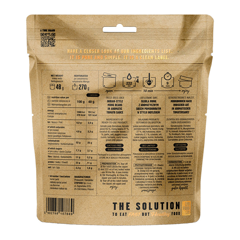V balení nejsou žádné umělé přísady, žádné přidané cukry, žádný palmový olej a žádné konzervační látky. Jídlo je vyrobeno ze 100% přírodních surovin. Všechny suroviny jsou z ekologických farem.