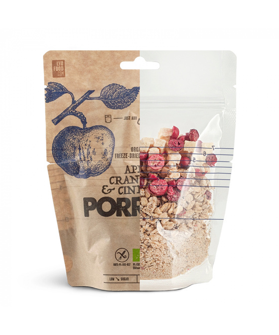 BISTRO Menu BIO kaše složená z bezlepkových ovesných vloček vařených s kokosovým mlékem a chia semínky, sladkých jablek, kyselých brusinek a špetkou skořice je lahodnou a vyváženou kombinací, která vám pomůže správně začít den.