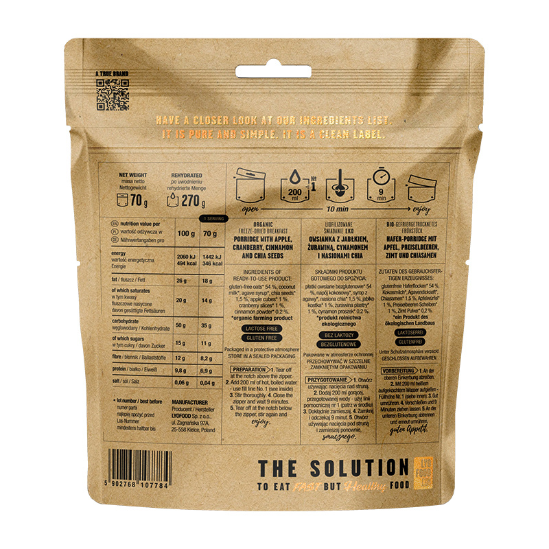 V balení nejsou žádné umělé přísady, žádné přidané cukry, žádný palmový olej a žádné konzervační látky. Jídlo je vyrobeno ze 100% přírodních surovin. Všechny suroviny jsou z ekologických farem.