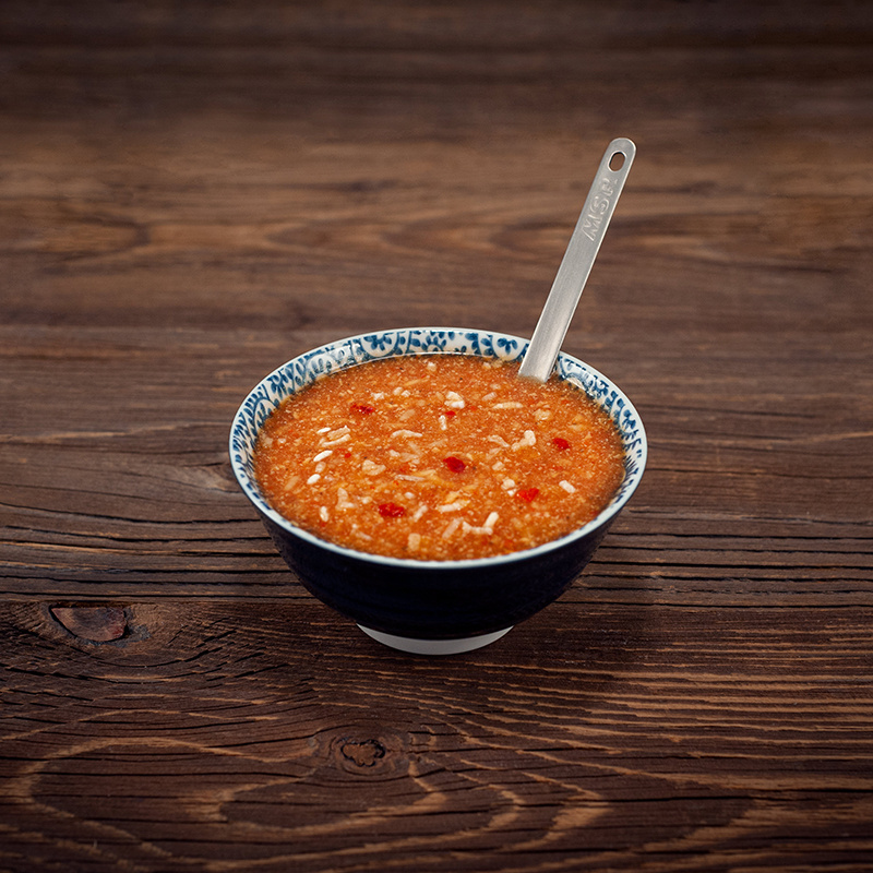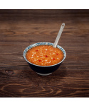 Hodně jsme experimentovali a stále znovu vařili a ladili, abychom objevili tu potřebnou výraznou chuť dokonalé rajské polévky. Malým tajemstvím je upéct červenou papriku a rajčata společně těsně před vařením. Velké tajemství neprozradíme, ale krémová textura polévky v kombinaci s hrstkou bílé rýže uspokojí každého hladového nadšence tohoto milovaného pokrmu.